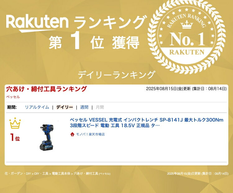 商品情報 メーカー名 ベッセル 品番 SP-8141J 商品説明 【商品特徴】 3段階スピード切り替えです。 手回しモードで、ナットを楽々取付けができます。 仮締めモードは自動シャトオフ機能で、締め過ぎ防止ができます。 最大パワーモードは小型車の整備に最適、余裕の300N・mです。 LEDライト搭載です。 手回しモード・自動シャットオフでタイヤ交換に最適化です。 【商品仕様】 四角ドライブ 12.7mmSQ(1/2”SQ) 能力 普通ボルトM10〜M20/高力ボルトM10〜M16 最大締付トルク(N・m):300 無負荷回転数(min??):2800 打撃数(回/分):0 〜3000 全長(mm):141 全高(mm):262 幅(mm):80 重量(kg)2.2(バッテリー含む) 【セット内容】 本体…1 バッテリーパック…1 充電器…1 取扱説明書…1 キャリングケース…1 関連商品【抽選で最大100%ポイントバック エントリー受付中】 ボッシュ コー...【抽選で最大100%ポイントバック エントリー受付中】 KTC 京都機...【抽選で最大100%ポイントバック エントリー受付中】 ボッシュ コー...38,519円40,637円37,766円【抽選で最大100%ポイントバック エントリー受付中】 KTC 京都機...【抽選で最大100%ポイントバック エントリー受付中】 ボッシュ バッ...【抽選で最大100%ポイントバック エントリー受付中】 ボッシュ バッ...40,110円40,233円39,480円【抽選で最大100%ポイントバック エントリー受付中】 ボッシュ バッ...【抽選で最大100%ポイントバック エントリー受付中】 KTC 京都機...【抽選で最大100%ポイントバック エントリー受付中】 milwauk...42,376円41,213円36,400円【抽選で最大100%ポイントバック エントリー受付中】 milwauk...【抽選で最大100%ポイントバック エントリー受付中】 milwauk...【抽選で最大100%ポイントバック エントリー受付中】 milwauk...41,500円41,600円34,400円 ベッセル VESSEL 充電式 インパクトレンチ SP-8141J 最大トルク300Nm 3段階スピード 電動 工具 18.5V 正規品 タイヤ交換