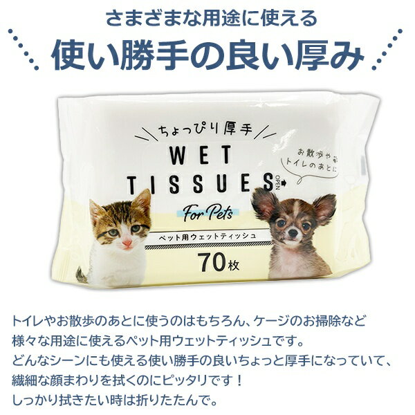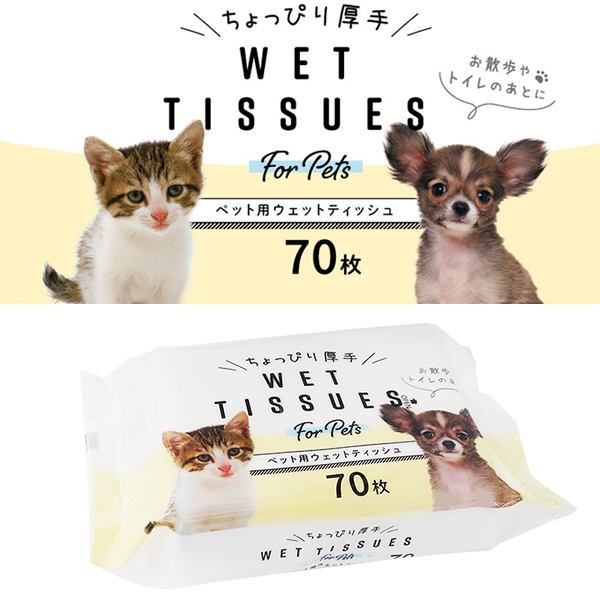 ペット用ウェットティッシュ 合計700枚セット(70枚×10袋) ちょっと厚手で使いやすい! ペット用ウェットティッシュ 合計700枚セット(70枚×10袋) ★たっぷり使える10袋(合計700枚)セット★ お掃除からカラダのお手入れにも! 様々な用途に使えるペット用ウェットティッシュ トイレやお散歩のあとに使うのはもちろん、ケージのお掃除など さまざまな用途に使えるペット用ウェットティッシュです。 どんなシーンにも使える使い勝手の良いちょっと厚手になっていて、 繊細な顔まわりを拭くのにピッタリ!しっかり拭きたい時は折りたたんで。 アルコール成分不使用・無香料なので安心安全。 除菌剤が含まれているので、安心して汚れを落とすのに使えます。 お散歩後の足ふきやトイレ後のおしりふきに。 ペットを飼ってる方はウェットティッシュは必需品! 大容量70枚入なので、気軽にたくさん使えます♪ サイズ:125×180mm(1枚あたり) 内容量:70枚入り(1袋あたり) セット内容:10袋(合計700枚) 材質:ポリエステル70%、レーヨン30% 成分:水、保湿剤、除菌剤 ※10袋セット(合計700枚)でのお届けとなります。 製品仕様 サイズ:125×180mm(1枚あたり) 内容量:70枚入り(1袋あたり) セット内容:10袋(合計700枚) 材質:ポリエステル70%、レーヨン30% 成分:水、保湿剤、除菌剤 ご注意 ※ペットのお肌に異常があるときやお肌に合わない場合には使用しないでください。 ※シートは水に溶けませんので、トイレには流さないでください。 ※ペットの口や耳、目のまわりに使用する場合は、液が入らないように絞ってからお使いください。 ※目に入った場合はすぐに水かぬるま湯で十分洗い流してください。 ※お子様の手の届かない場所に保管してください。 ※直射日光のあたる場所や高温になる場所に保管しないでください。 ※使用後は乾燥を防ぐため、ふたシールをしっかり閉めてください。 ※10袋セット(合計700枚)でのお届けとなります。