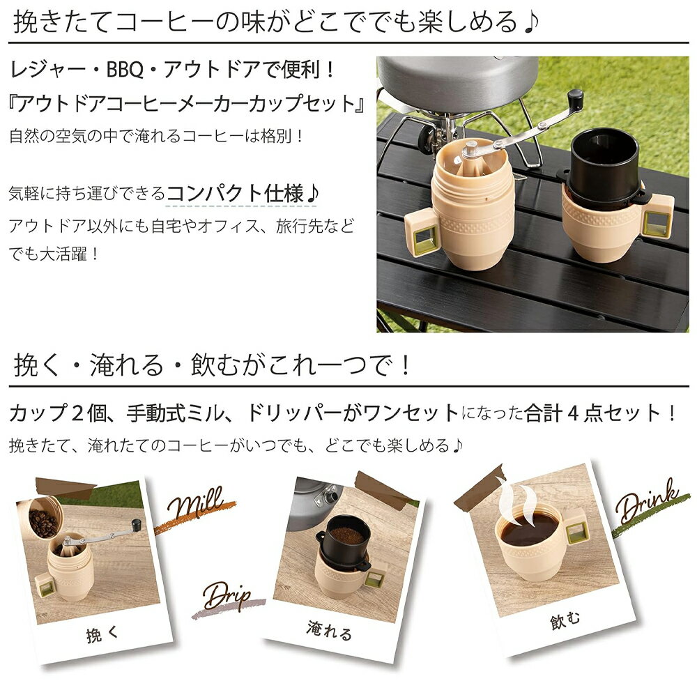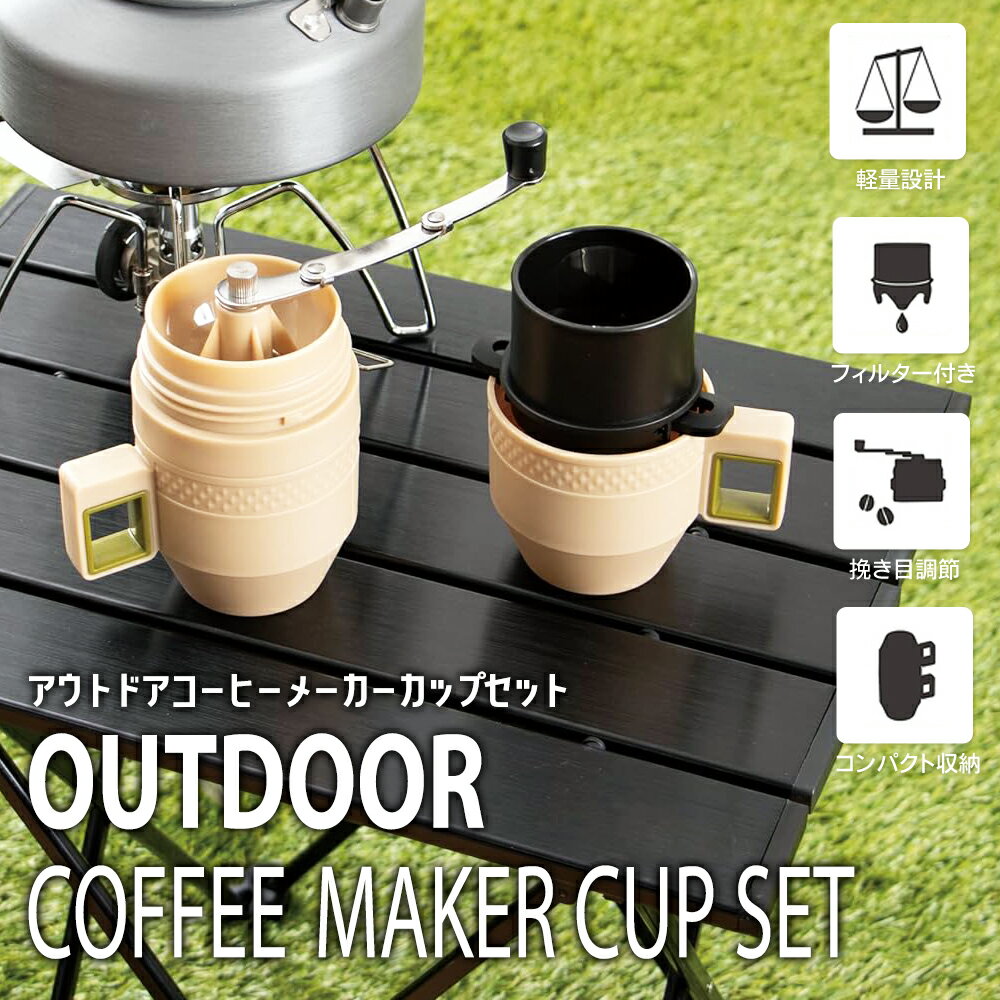 アウトドアコーヒーメーカーカップセット 手動ミルとドリッパー、カップが一体に!挽きたてコーヒーがどこでも味わえる! 挽く・淹れる・飲むがこれひとつでできちゃう! カップ2個、手動式ミル、ドリッパーがワンセットになった アウトドアコーヒーメーカーカップセット。 キャンプやトレッキング、BBQなどのアウトドア、 レジャーシーンで淹れたてコーヒーをお楽しみください♪自然の空気の中で淹れるコーヒーは格別! 気軽に持ち運びできるので、旅行先やオフィスにもおすすめですよ。 手動式ミルの調節ツマミを操作することで、粗挽き・細挽きの調節ができます。 豆やその日の気分に合わせて調整OK◎ フィルター部分はステンレス製で、洗って繰り返し使用できます。ペーパーフィルター不要!エコで経済的♪ すべてのパーツがひとつになる一体型。使用しないときもコンパクトに収納。 気軽に持って出かけられそうですね★ ■ 商品仕様 ■ 品名 アウトドアコーヒーメーカーカップセット 本体サイズ 約10.0×7.5×15.5cm 本体重量 約340g 材質 カップ:PP・ABS ミル:PP・アルマイト研磨セラミック・ステンレス鋼・ABS ドリッパー:PP・ステンレス鋼 満水/適正容量 218ml/180ml(カップ1個あたり) 耐熱温度 PP:95度、ABS:80度 カラー ベージュ セット内容 カップ2個、手動式ミル1個、ドリッパー1個 ※直火や電子レンジ、冷凍庫では使用しないでください。 ※ハンドルは必ず時計回りに回してください。空回しや逆回転は挽き臼をいためる原因になりますので絶対におやめください。 ※豆は様子を見ながら少しずつ入れてください。 ※長期間のご使用により臼が磨耗し、切れ味が落ちる場合があります。 ※ミルはコーヒー豆以外にはご使用にならないでください。 ※飲み物を入れた状態で長時間放置しないでください。 ※つけ置き洗いはしないでください。 ※煮沸しないでください。 ※食器洗浄機・乾燥機は使用しないでください。 ※シンナーやベンジン・磨き粉・クレンザー・漂白剤・金属たわしなどを使用しないでください。 ※セット内容以外は付属しません。