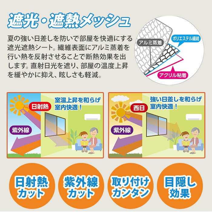 遮光・遮熱メッシュ(両面テープ貼り) 4枚組 90×180cm 断熱シート 遮熱シート 窓シート 夏 日差し 日よけ 節電 省エネ エコ 暑さ対策 猛暑対策 紫外線 UVカット 遮光フィルム 目隠し