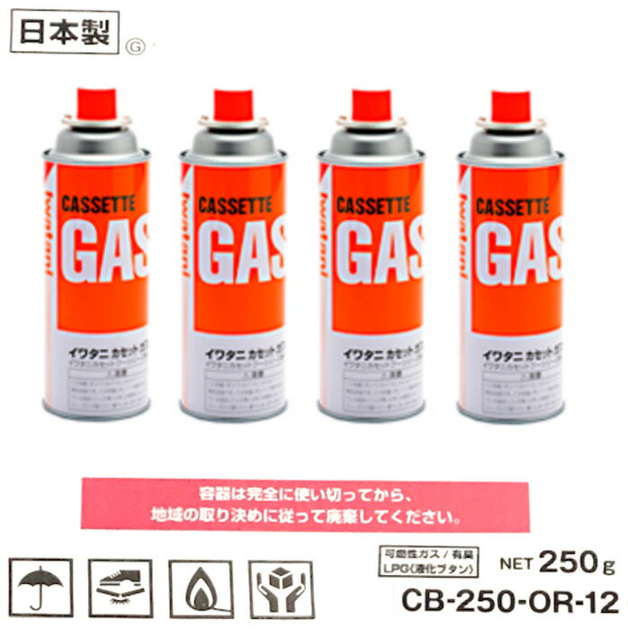 岩谷産業 イワタニカセットガス カセットボンベ12本組×1箱 CB-250-OR-12防災対策 カセットコンロに必須ストックで安心◎ ライフライン確保 備蓄 即納致します! 仕様【1本当たり】本体サイズ:68(直径)×198(高さ)mm使用ガス:LPG(液化ブタン)内容量:250g商品説明イワタニのカセットコンロ用カセットガス(カセットボンベ)です。品番:CB-250S-ORカセットコンロ(卓上コンロ)など様々なイワタニiwataniカセットガス器具に使えるカセットボンベ。カセットコンロを使用し、鍋料理や土鍋料理など、ほっかほかの温かい料理を囲んで召し上がってはいかがでしょうか♪台風や地震など、ライフラインを確保するための防災対策としての備蓄としてもお薦めです。★注意事項★※外箱に直接、伝票を貼り付けてお送りさせて頂きます。※外箱に保管輸送中の傷、スレ、多少の汚れ等がある場合がございますが、ご了承の上ご購入をお願い致します。※ご利用のモニター環境により、色合いが異なって見える場合がございます。 2