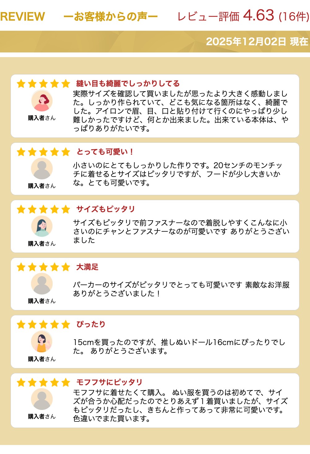 関連商品ぬい服 10cm 15cm 20cm ぬいぐるみ スーツ セット 上着...ぬい服 10cm ぬいぐるみ 3点セット ケープ トップス 魔術師 ...新色追加 ぬい服 10cm 15cm 20cm ぬいぐるみ ポンチョ ...1,680円2,300円1,500円ぬい服 10cm 15cm ぬいぐるみ コスチューム 着ぐるみ ねこ ...ぬい服10cm 15cm 20cm ぬいぐるみ コスチューム ジップパ...ぬい服 5点セット10cm 15cm ぬいぐるみ コスチューム 王子 ...1,500円1,160円2,890円Cheriotte ハードシェルポーチ ハート クリア 推し色 シンプ...ぬい服 20cm ぬいぐるみ用 着ぐるみ コスチューム 推しぬい 犬 ...【送料無料】ぬい服 10cm ぬいぐるみ モルモット コスチューム 小...1,760円1,700円1,900円ぬい服 10cm 15cm 20cm ぬいぐるみ コスチューム スウェ...ぬい服 パーカー 単品 フード付き 10cm 15cm 20cm ぬい...ぬい服 10cm 15cm 20cm ぬいぐるみ用 シャツ Yシャツ ...1,300円800円900円【最強配送・送料無料】ぬい服 2点SET10cm 15cm 20cm ぬいぐるみ コスチューム ジップパーカー フードパーカー チャック デニムパンツ 着せ替え 洋服 服 ぬい アニマル 推し活グッズ 推しマスコット ヲタ活 オタク アイドル オタ活 ヲタ活 グッズ おしゃれ かわいい ぬい服 ぬいぐるみ服 洋服 コスチューム ぬいぐるみ用 服 着せ替え かわいい ぬいぐるみ用のジップパーカーとズボンのセットです。 ベーシックなデザインでどの子にも合います。 【お詫びとご注意】 現在、システムの仕様上、在庫がない場合でも異なる組み合わせで同じ商品(別ページ含)を複数カートに入れることが可能となっております。 〈例〉イエローのトップスが1点しかない場合でも、以下のような組み合わせでカートに入れることができます。 (1)トップス:イエロー + ボトムス:ブラックA (2)トップス:イエロー + ボトムス:ブルーB 在庫管理には細心の注意を払っておりますが、万が一、ご注文が在庫を超えてしまった場合は、別途ご相談のご連絡を差し上げることがございます。 何卒ご理解のほどよろしくお願いいたします。 ●COL: ◆ジップパーカー ホワイト/ピンク/レッド/パープル/イエロー/ライトブルー/ネイビー/グレー/ブラック ◆デニムパンツ ホワイトA/ホワイトB/ライトブルーA/ライトブルーB/ブルーA/ブルーB/ ネイビーA/ネイビーB/グレーA/グレーB/ブラックA/ブラックB ●MATERIAL:ポリエステル ●MADE IN CHINA ※大変小さい部品がございますので、丁寧に取り扱いいただきますようお願いいたします。 ※ご利用のPCやスマホなど表示機器の都合上、若干の差異が生じますことをあらかじめご了承ください。 ※再生産により生地の色合いや紐の種類が変更になる場合がございます。 ※長時間の着用はぬいぐるみへの色移りの可能性が高くなります。 ※洗濯やアイロンがけを行うと、生地が縮んだり破損することがございます。 当ショップのぬいぐるみのお洋服について 中国を中心としたアジアで人気の着せ替えぬいぐるみ、棉花娃娃(ミェンファーワーワー)のお洋服です。 サイズ・デザインによっては棉花娃娃以外のキャラクターや動物のぬいぐるみさんもご着用いただけます。 サイズ感につきましては、モデルプロフィールの画面にてサイズをご参考にしてご購入をお願いいたします。 ○cmの表示については棉花娃娃向けのサイズ表記で、全てのぬいぐるみに対応いたしかねますのでご了承ください。 【店長のコメント】 計324組合せを設定しました。 もう少し早くこのセット販売を実施したかったのですが、 システム上ひとつずつセットを組む必要があり苦労しておりました。 お客様に喜んでいただけますと幸いです。 ぬい活のお力添えとなりますように。 ▼単品ページはこちら▼\ CLICK ! / 5 5