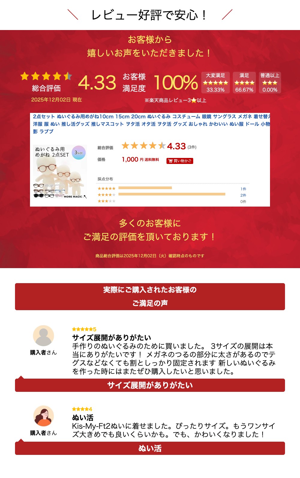 関連商品ぬい服 10cm 15cm 20cm ぬいぐるみ用 シャツ Yシャツ ...ぬい服10cm 15cm 20cm ぬいぐるみ コスチューム ジップパ...ぬい服 パーカー 単品 フード付き 10cm 15cm 20cm ぬい...900円1,160円800円ぬいぐるみ 帽子 10cm 15cm 20cm 無地 バケットハット ...【ランキング受賞】ぬいぐるみケース ケース ぬい撮り ポーチ labu...新色追加 ぬい服 10cm 15cm 20cm ぬいぐるみ ポンチョ ...1,030円990円1,500円ぬい服 10cm 15cm ぬいぐるみ コスチューム 着ぐるみ ねこ ...ぬい服 20cm 15cm 靴 ブーツ シューズ ぬいぐるみ コスチュ...ぬいぐるみポーチ ぬいポーチ ぬいバッグ ぬい撮り ポーチ 推し活バッ...1,500円1,070円750円ぬいぐるみポーチ ぬいポーチ ぬいバッグ ぬい撮り ポーチ 推し活バッ...ぬい服 10cm 15cm 20cm Tシャツ ぬいぐるみ コスチュー...ぬい服 10cm 15cm 20cm ぬいぐるみ コスチューム スウェ...950円680円1,300円【2点セット】ぬいぐるみ用めがね10cm 15cm 20cm ぬいぐるみ コスチューム 眼鏡 サングラス メガネ 着せ替え 洋服 服 ぬい 推し活グッズ 推しマスコット ヲタ活 オタ活 ヲタ活 グッズ おしゃれ かわいい ぬい服 ぬいぐるみ服 洋服 コスチューム ぬいぐるみ用 服 着せ替え かわいい ぬいぐるみ用のめがね♪ ベーシックなデザインでどの子にも合います。 Sサイズ:4.5cm Mサイズ:6.5cm Lサイズ:9cm 内容:メガネ2点 ●COL:ブラウンA/ブラウンB/グレー/ブラック/ピンク/ブルー/ホワイト/クリア/パープル/オレンジ ●MATERIAL:プラスチック ●MADE IN CHINA ※衣装(コスチューム)のみでぬいぐるみ本体は付属しません。 ※大変小さい部品がございますので、丁寧に取り扱いいただきますようお願いいたします。 ※ご利用のPCやスマホなど表示機器の都合上、若干の差異が生じますことをあらかじめご了承ください。 ※再生産により生地の色合いやパーツの種類が変更になる場合がございます。 ※長時間の着用はぬいぐるみへの色移りの可能性が高くなります。 ※小さく繊細な商品です。誤飲防止のため小さなお子様のお手の届かない場所でお取り扱いください。 ※洗濯やアイロンがけを行うと、生地が縮んだり破損することがございますのでご注意ください。 【店長からのお詫び】 このたび、より多くのお客様に喜んでいただけるよう セット販売を追加させていただきました。 これまで単品ずつセットにしてご購入いただいたお客様には急な変更となり誠に申し訳ございません。 恐縮ではございますが、ご理解いただけますと幸いです。 今後ともご愛顧を賜りますようお願い申し上げます。 【当ショップのぬいぐるみのお洋服について】 中国を中心としたアジアで人気の着せ替えぬいぐるみ、棉花娃娃(ミェンファーワーワー)のお洋服です。 サイズ・デザインによっては棉花娃娃以外のキャラクターや動物のぬいぐるみさんもご着用いただけます。 サイズ感につきましては、モデルプロフィールの画面にてサイズをご参考にしてご購入をお願いいたします。 ○cmの表示については棉花娃娃向けのサイズ表記で、全てのぬいぐるみに対応いたしかねますのでご了承ください。 ▼単品ページはこちら▼\ CLICK ! / 5 5