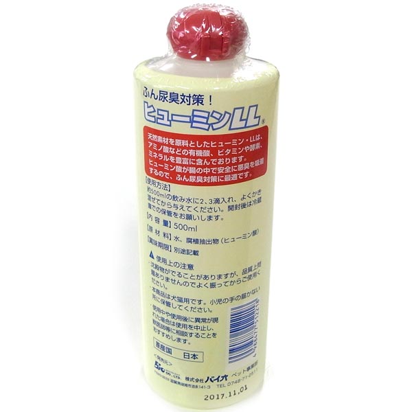ワンちゃんやネコちゃんを室内で飼われている飼い主さんの中には、フン、尿のニオイでお悩みの飼い主さんも多いのではないでしょうか。そんな飼い主さんに、オススメしたいのが、バイオさんの「ヒューミン」です。ワンちゃんやネコちゃんの飲み水の中に、2〜3滴垂らして、あげるだけで、ヒューミンが体内の悪臭成分を吸着し、フン、尿臭を軽減してくれます。お悩み中の飼い主さんは、ぜひ一度お試しください。商品の特徴*ワンちゃんやネコちゃんが糞尿をした後に、土や砂をかけて、糞尿臭を消しているのを見て開発されました。*土や砂に含まれている消臭効果成分「ヒューミン酸」が、腸内の悪臭成分を安全に吸着し、糞尿臭を軽減してくれます。*100%天然由来原料ですので、安心してあげられます。*アミノ酸などの有機酸、ビタミンや酵素、ミネラルも豊富に含まれています。対象;犬猫商品区分;犬猫用消臭グッズメーカー;バイオ原材料;水、腐植抽出物(ヒューミン酸)消費期限(最長);製造から18ヶ月生産国;日本*約500mlの飲み水に対し、2〜3滴を入れ、良くかき混ぜてあげてください。【配送先が北海道・沖縄県へのご注文につきまして】3980円以上一律送料無料にともない、システムや楽天市場の規約の関係で、送付先が 北海道・沖縄県 のご注文につきましては、弊店にて送料を負担することが難しいため、大変、心苦しくはございますが、ご注文をいただきましてもキャンセルとさせていただきます。キャンセルにともなうポイント・クーポンなどの返還の保証はできません。ご理解いただけますよう、お願い申し上げます。