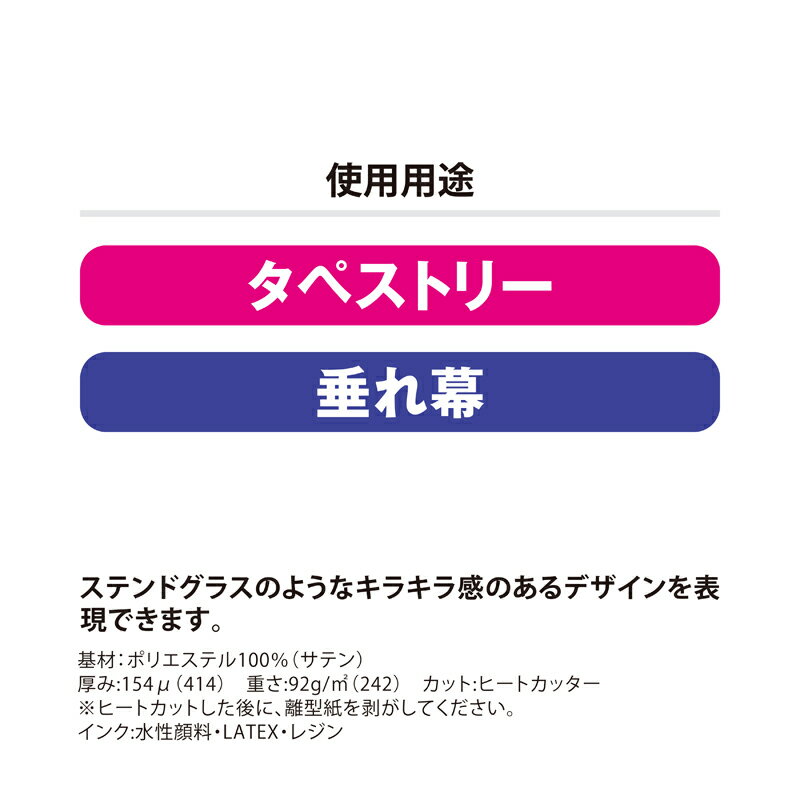 【生地種類】ブライダルサテン 【生地寸法】幅1067mm×長さ10m 【紙管内径】2インチ 【素材】ポリエステル100%(サテン) 【セパレーター】紙 【生地厚み】154μ (414μ) 【生地重量】92g/m2 (242g/m2) 【製品重量】 【対応インク】水性 【カット方法】ヒートカッター 【主な用途】タペストリー、垂れ幕など 【入り数】1本 【特長】 ●手触りが柔らかくなめらかなサテン生地のポリエステルクロスです。 ●光沢がある生地なので、ステンドグラスのようなキラキラ感があるデザインを表現できます。 ●お持ちの大判プリンタで印刷できるため、納期を気にすることなく作成できます。 ※ヒートカッターを使用して、カットした後に離型紙を剥がしてください。 ご注文・配送に関しての注意事項 ■印刷する際は対応したプリンタ及びインクを使用してください。メーカーホームページで プリンタ設定等ご確認のうえ、ご購入お願い致します。 ■メーカーからの直送品のため、代引きでの対応ができない商品です。 ■大型商品のため軒先渡しとなります。予めご了承お願いいたします。 また軒先渡しの商品のため到着後、お客様で設置していただく必要があります。 ■運送会社の指定及び時間指定等は行えませんので予めご了承願います。 ■取り寄せ商品のため、お客様都合でのキャンセル・返品・交換は致しかねます。 ご注文時に商品仕様等をご確認のうえ、お間違いの無いよう注文お願い致します。 ■納期はメーカー在庫がある場合の目安です。在庫切れの場合は別途ご連絡いたします。 ■在庫切れや納期が予定より延びた場合によるキャンセルは承っております。