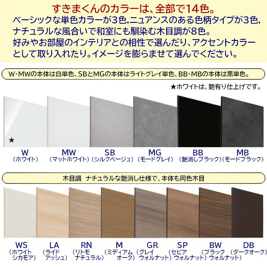 幅は56cmから80cmまでの間で1センチ間隔でオーダーでき、わずかなすきまも有効利用できます。 奥行は32cm/42cm/52cmの3パターン、色も14色の中から選べます。 確かな品質の日本製、一台ずつ受注生産で製作されるランドリー収納です。 下着やパジャマなどを収納すれば、風呂上りの着替えもスムーズに。 洗面台や洗濯機周辺の狭小スペースも活用できます。 脚部の9cmの空間は、体重計やスリッパ収納に便利です。 【お部屋のイメージに合わせて選べるカラー全14色】 ベーシックなホワイト・ブラックなどの単体カラーから、ニュアンスのある色柄タイプ、ナチュラルな風合いの木目調まで全14色と充実したカラーバリエーションで、インテリアとなじむコーディネートが実現します。 ※ ホワイト(W),マットホワイト(MW)の本体(側面や棚板)はホワイト単色,シルクベージュ(SB),モードグレイ(MG)の本体はライトグレイ単色,艶消しブラック(BB),モードブラック(MB)の本体はブラック単色です。 木目調の8色につきましては、本体も同色木目になっています。 【多段チェストの足元には便利な空間付き】 多段チェストの足元には9cmの空間を設けてあり、体重計やスリッパなどが収納できます。 【引出しは耐久性のある箱組構造,スライドレール付き】 前板が外れにくい箱組構造で、耐久性があります。 奥まで見渡せ取り出し易いスライドレール付きです。 開閉もスムーズな使用感です。 【幅木カットで¨壁ピタ¨】 幅木を避け壁にピッタリつけられます。 【高級感のある柔らかな縁加工「エアテック」 ドイツのホマッグ社の縁貼り加工機「エアテック」により、仕上げられています。 扉や引出し前板等のエッジと本体の境目に段差がなく、塗装したような高級感漂う仕上げです。水濡れにも強く、日々のお手入れも簡単です。湿気や温度変化が懸念されるキッチンやランドリールーム等にも置いていただけます。 【国産家具】 家具によるアレルギー反応に配慮されており、合板類や接着剤はF☆☆☆☆製品が使われています。原材料である木材は「合法木材(違法伐採ではない木材)」の取扱業者から仕入れられています。 【汚れやすり傷に強く、お手入れカンタン】 家具本体(白単色)の側板・背板・引出しの底板には最新の耐汚染性シート「クリーンイーゴス」が使用されています。 サッと拭き取るだけで、汚れが落ちやすく、すり傷にも強いので、お手入れが簡単です。 サイズ:幅56〜80cm×奥行32/42/52cm×高さ92.3cm ※ この商品は、受注生産となっており、発送迄の納期概ね4~5週間程度要します。ご注文後、発送日の連絡をいたします。 ご注文後のキャンセル・変更は一切承りかねます。サイズ・色など、ご注文内容を十分ご注意の上、ご注文下さい。 ※ 商品の配送は家具専門の配送で、宅内への運び入れ,開梱,梱包材の持ち帰りまでの配送を手配致します。 離島,山間部等一部地域で配送できない地域、配送の曜日が限られている地域、配送時間帯の指定が出来ない地域があります。 ご注文いただきましたら、配送の可否,配送可能な曜日,時間帯指定等についてお知らせ致します。また、事前に森下和洋家具にお問い合わせいただければ、お答えするように致します。お問い合わせの際には、ご検討の商品,サイズと共にお送り先のご住所(町名程度迄)と設置階をお知らせ下さい。