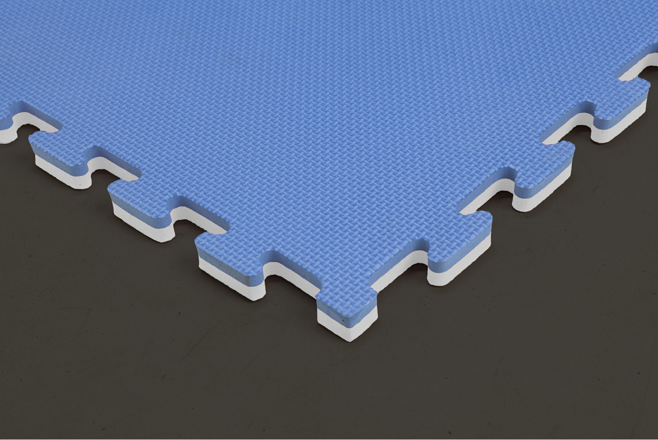 ■税・送料込み2750円(1枚) ■カラー 青/赤 青/白 ■サイズ 1m×1m×2cm(湿度により若干伸び縮みします) ■重量 2.6kg ■高度 55度(公式競技用マットと同硬度) ■素材 EVA ※他社のものとはジョイント部分が合いませんのでご注意下さい。 4辺のうち3辺に耳の部分が付いていますので(取り外し可)コートの外周が直線に仕上がり、小さなお子様がジョイント部分に足を引っかけ転倒する危険性がなく外観的にも優れています。 設置場所の形状に合わせてカッターで簡単にカットすることができます。 ※無料サンプル(小さくカットしたもの)ご希望の方はこの商品のお問合せボタンまたはお電話でご連絡下さい。 梱包を解いた後、多少においがしますが数日後に消えます。 その間、設置場所を換気するか室外に置いてからご使用下さい。 製造上、表面に少し油が付いています。 使用中に取れてきますが滑りやすく感じる場合は家庭用洗剤をぬるま湯でうすめ拭き取って下さい。 空手道場、試合会場、(キック)ボクシングジム、フィットネスジム、幼稚園等でフロアマットとして使用されています。 また保温性があり積み重ねると場所をとりませんので災害時の避難場所への設置に最適です。