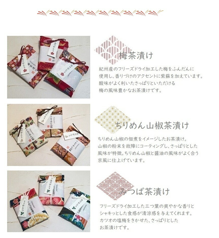 【この商品は次の用途に適しています♪】 退職 お礼 退職ご挨拶 退職お礼の品 和のギフト お茶漬け お茶漬けギフト お茶漬けの素 梅 ちりめん みつばイベント記念品 結婚プチギフトおしゃれ 周年記念 プレゼント ギフト 粗品 引っ越しご挨拶メッセージシール ノベルティ ブライダルプチギフト シンプル 和のプチギフト 出産内祝い 内祝いギフト 結婚内祝い 新築内祝い 快気祝 快気内祝い 引き出物 入学内祝い 返礼 プレゼント プチギフト 退職挨拶 引っ越し挨拶 2次会引き出物 卒業記念 周年記念品 大量 お配り 内祝いギフト 記念品 内祝い ギフト 記念品 商品の概要 名称 たおやかな「お茶漬け・布包み」1p 3種のお味よりアソートです 特徴 京都では「ぶぶ漬け」と呼ばれ、さまざまな逸話や小話が 数多く残るお茶漬け。 手軽にさらさらっと軽くリセットしてくれる日本が生んだ、 素朴で素敵な食文化の一つです。 そんな「お茶漬けのもと」を厳選し、カジュアルでちょっとした プレゼントにも最適な形にしました。 京都の生地問屋さんから届く布地で包んだ「布包みのお茶漬け」は やさしい和やかな空気も一緒にお届けします。 メッセージシールをお選びいただけます。 ご用途に応じてご利用くださいませ。 内容 布包みお茶漬け1個 「みつば」「梅」「ちりめん山椒」の3種より アソートで3種をほぼ均等でお届けします。 「うめ茶漬け」 --------------------- ●名称:お茶漬け ●原材料名:食塩(国内製造)、味付けしそ(しそ、 食塩、砂糖、還元水あめ、デキストリン、梅酢)、 あられ、味付けわかめ(わかめ、砂糖、食塩、 魚介エキス)いりごま、梅干加工品(梅干、しそ液) 砂糖、のり、乳糖、しょうゆ、かつお節粉末、 コーンスターチ、抹茶、小麦粉、魚介エキス調味料、 昆布粉、酵母エキス、調味料(アミノ酸等)、 酸味料(一部に乳成分・小麦・ごま・大豆を含む) ●内容量:1包み(4gx2袋) 「みつば茶漬け」 --------------------- ●名称:お茶漬け ●原材料:食塩(国内製造)、あられ、いりごま、 のり、砂糖、乳糖、味付けみつば、しょうゆ、かつお節 粉末、コーンスターチ、抹茶、小麦粉、魚介エキス調味 料、昆布粉、酵母エキス、調味料(アミノ酸等) 一部に乳成分・小麦・ごま・大豆を含む) ●内容量:1包み(4gx2袋) 「ちりめん山椒茶漬け」 --------------------- ●名称:お茶漬け ●原材料名:食塩(国内製造)、いりごま、味付け しらす (ちりめん、デキストリン、食塩、砂糖、乳糖、 しょうゆ)、砂糖、乳糖、のり、山椒粉末、しょうゆ、 味付けみつば、かつお節粉末、コーンスターチ、抹茶、 小麦粉、魚介エキス調味料、昆布粉、酵母エキス、 調味料(アミノ酸等)、酸化防止剤(ビタミンE) 一部に乳成分・小麦・ごま・大豆を含む) ●内容量:1包み(4gx2袋) 製造国 日本 賞味期限他 賞味期限リストでご確認くださいませ。 配送方法 常温にてヤマト宅配便でお届け致します。 サイズ お茶漬け1個の本体サイズ:9.5×8×1cm ☆パソコンの環境、または撮影時の照明や フラッシュ等により、多少商品画像と色合いが 異なる場合がございます。 予めご了承のほどお願い申し上げます。京都の生地問屋さんから届く布地で包んだ「布包みのお茶漬け」は やさしい和やかな空気も一緒にお届けします。 退職、退院、お引っ越し、ちょっとしたお礼にも・・・。 また会社の周年記念、店舗の開店記念など、皆様にお渡しするのに最適です。 「ありがとう」のメッセージタグもついています。 「お茶漬けのもと」を厳選し、カジュアルでちょっとしたプレゼントにも最適な形にしました 勤務先等で、「みなさんに・・」と分けていただくのもおすすめです マザーランディアのギフトは「Hart&Fit♪」。 お客様にも先様にも、気持ちをこめて寄り添って 皆さまにピッタリの ギフト をご案内いたします。 結婚式、転職、引っ越し、退職などのいろいろなシーンでご利用いただける プチギフト 、プレゼント 、お礼の品 。 大人らしく、おしゃれで上品な ギフト は 贈る側も、お受け取りになる先様にもきっと喜んでいただけるはず。 大げさではないけれど、感謝 の気持ちをきちんと自然体で伝えられるよう お手伝いをさせていただきます。 また会社やお店、団体、教室スクールなどの周年記念 イベントでも ご利用いただけるよう 個包装 で 大量 におつくりすることも可能です。 ご不明な点がございましたら、いつでもお問合せいただければと思います。