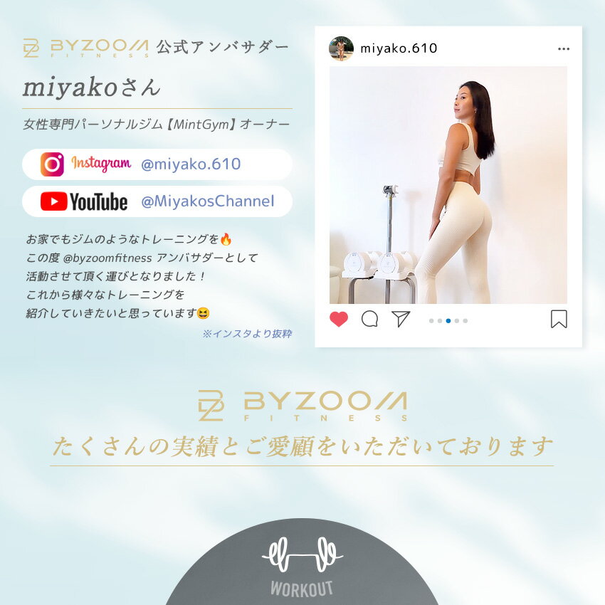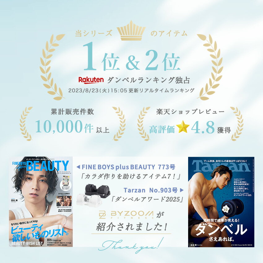 【正規品】可変式ダンベル 12.5kg|BYZOOM FITNESS Pure Series 特許取得済みスライドシステムを採用し、2.3kg~12.5kg/10段階をワンステップで瞬時に切替。 高耐久設計で故障問い合わせゼロを継続中。ホームジムを格上げする高級デザインの可変式ダンベルです。 Pure Series 可変式ダンベル12.5kg が選ばれる 6 つの理由 10段階×瞬時切替 ─ スライドノブを引いて重量プレートを選ぶだけ 2.3kg~12.5kg の細かなステップで初心者~中級者を完全カバー 高耐久ボディ ─ 厳しい耐久テストをクリアした構造で故障0件実績 ローレット加工グリップ ─ 汗をかいても滑りにくい安全ホールド 幅が重量に合わせて自動可変 ─ 軽重量時は取り回しスリム インテリア映えデザイン ─ マットブラック/ピュアホワイトの2色 重量バリエーション(10段階) kg 2.3 / 3.4 / 4.5 / 5.6 / 6.8 / 7.9 / 9.1 / 10.2 / 11.4 / 12.5 主な仕様 ブランド:BYZOOM FITNESS (バイズーム フィットネス) シリーズ:Pure Series タイプ:可変式ダンベル(特許スライド式) サイズ: 約39.5cm×20.5cm×17cm(トレイ含) カラー:ブラック / ホワイト グリップ:32mmローレット加工メタルハンドル 備考:特許取得済 、レビュー投稿で1年保証(通常3ヶ月) 使い方は簡単 3 ステップ 台座にダンベルを正しくセット スライドノブを引き、希望の重量までスライド 真上に持ち上げてトレーニング開始 注意事項 重量は最大で約±0.5kgの誤差が生じる場合があります 製品を落下させると故障につながる恐れがあります こんな方におすすめ 筋トレ初級者~中級者 インテリアを損なわず本格筋トレをしたい方 細かい重量ステップで徐々に負荷アップしたい方 ダンベルラックの場所を取らず省スペースで鍛えたい方 壊れにくく長く使える可変式ダンベルを探している方 関連キーワード: 可変式ダンベル / スライド式ダンベル / BYZOOM FITNESS / バイズームフィットネス / Pure Series / 25kgダンベル / 高耐久ダンベル / ローレットグリップ / 特許取得ダンベル / ホームジム / 筋トレ器具 / 省スペース / おしゃれダンベル