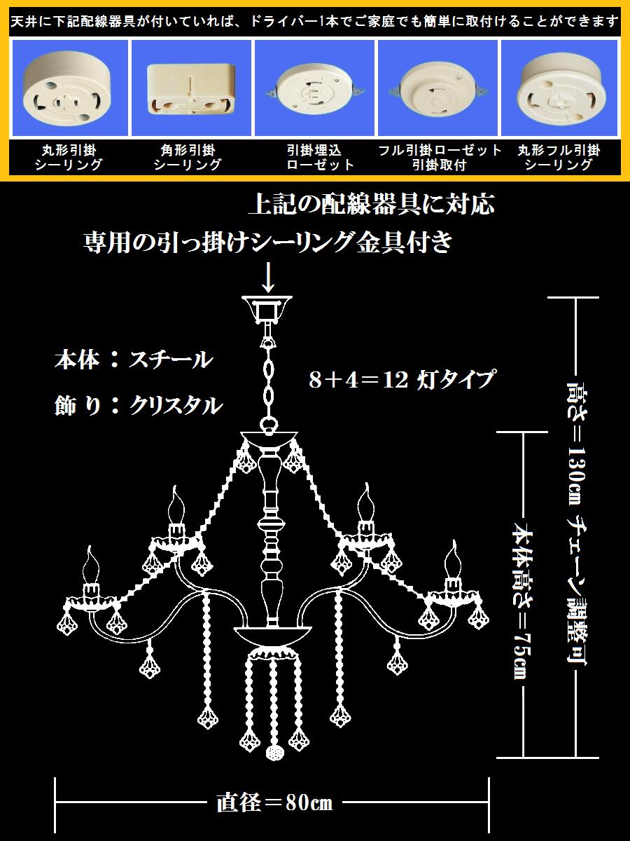 同梱不可商品 ■全国一律送料無料。 ■離島の場合、別途見積もりいたします。 ■ご注文確認後の翌日に発送させて頂きます。 ■他のシャンデリア関連商品も取り扱っております。是非ご覧下さい 超特大型 4段 40灯(16+12+8+4)タイプ シャンデリア。商品詳細は下記画像をクリックしてご覧下さい 超大型 3段 21灯(12+6+3)タイプ シャンデリア。商品詳細は下記画像をクリックしてご覧下さい 大型 2段 15灯(10+5)タイプ シャンデリア。商品詳細は下記画像をクリックしてご覧下さい 大型 2段 12灯(8+4)タイプ シャンデリア。天井の引っ掛けシーリングに対応。商品詳細は下記画像をクリックしてご覧下さい 中型 2段 9灯(6+3)タイプ シャンデリア。天井の引っ掛けシーリングに対応。商品詳細は下記画像をクリックしてご覧下さい大型 豪華 シャンデリア 2段 12灯(8+4)タイプ ブラック 組立て式 専用の引っ掛けシーリング金具付き 天井の引っ掛けシーリングに対応 商品仕様 適切な部屋の目安 : ~ 12 畳 ■サイズ:直径=80cm 高さ=75cm~130cm 重さ≒8.5kg 12灯(8+4)タイプ 2段 ■材質&色:本体 ⇒ スチール(黒メッキ) 飾り ⇒ クリスタル(カットガラス ブラック) ■ライトコントロールスイッチ(調光器付き壁スイッチ)に対応しておりお好みの明るさに調整可能です。 専用の引っ掛けシーリング金具付き 天井の引っ掛けシーリングに対応 電球仕様 ■電球は別売りとなります。下記電球を用意しております。 ※全方向タイプLED電球(ろうそく形) 金額 1 個 = 980 円 ⇒ ご注文はこちらへ ★通常市販 1 個=1,000以上。シャンデリアをご購入頂いた方に限り特別価格で提供させて頂きます。 仕様 ◎E17口金 ◎消費電力:5W ◎全光束(明るさ)450ルーメン(白熱電球約40W相当) ◎光色:電球色 ◎全長:110mm ◎最大径:35mm ◎設計寿命:長寿命40000時間 (参考値。設計寿命は、光束が70%に低下するまでの時間です。保証期間を特別に記載しているものは該当しません) ◎室内用(屋外使用不可) ◎調光不可 ※調光器対応LED電球(全方向タイプ) 金額 1 個 = 1,080 円 ⇒ ご注文はこちらへ ★通常市販 1 個=1,200以上。シャンデリアをご購入頂いた方に限り特別価格で提供させて頂きます。 仕様 ◎E17口金 ◎消費電力:4W ◎全光束(明るさ)440ルーメン(白熱電球約40W相当) ◎光色:電球色 ◎全長:110mm ◎最大径:35mm ◎設計寿命:長寿命20000時間 (参考値。設計寿命は、光束が70%に低下するまでの時間です。保証期間を特別に記載しているものは該当しません) ◎室内用(屋外使用不可) ◎調光可 ※調光タイプのLEDをご利用される場合は、市販の汎用LED調光器(市販品)が必要です。 注意していただきたいこと ■初期不良品の場合は、一週間以内にご連絡頂ければ、部品交換か、同等商品と交換いたしますが製造上・輸送等での多少の小傷は、何卒ご容赦をお願いいたします。 ■本商品は組立て式です。付属の【組立説明書】に従って組立施工可能です。組立に不安な方は電気工事業者にご依頼していただくか、当社同じ商品組立済み、配線済みの完成品 ――【簡易取付式】⇒ こちらをクリックしてご確認ください ☚ のご購入をご検討ください。組立及び取付方法など事前にお知りになりたい方はお気軽に質問欄又は motoi-r@shop.rakuten.co.jp にお問い合わせください。 ■取付簡単。専用の引っ掛けシーリング金具付きで天井の引っ掛けシーリングに対応しており、ドライバー1本でご家族でも簡単に取り付けることが可能です。天井の引っ掛けシーリングは商品仕様写真をご参考ください。 ■同じタイプの【 ゴールド 】 ☚ と 【 シルバー 】 ☚ も取り扱っております。 ■ストア内他の【 シャンデリア 】 ☚ 商品も是非ご覧ください。