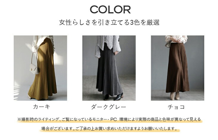 商 品 詳 細 ポイント プリーツ加工が印象的なロング丈スカートです。ウエストはゴム仕様で、快適なフィット感を実現。裾に向かって広がるシルエットが、歩くたびに揺れて女性らしさを引き立てます。程よい光沢感のある生地で、上品な印象に。トップスをインしてもアウトしてもバランスよく決まり、着回し力も抜群です。パンプスやブーツとの相性も良く、オンオフ問わず活躍します。季節の変わり目にも重宝する、着映え力の高い一枚です。 カラー ダークグレー/チョコ/カーキ※商品の色は物撮りをご参照ください。 サイズ 【フリー】総丈86cm/ウエスト66-76cm※製造工程の関係上、各採寸箇所実寸(平置き)より【約±3cm】程度は誤差の許容範囲とさせて頂いております。 素 材 レーヨン50%・ナイロン30%・ポリエステル20% 厚 さ ふつう 伸縮性 あり 透け感 なし 裏 地 なし ポケット なし モデル 身長160cm(着用サイズフリー) 季 節 秋/冬 生産国 China 注意点 ※生産時期により、色・サイズ・デザインが多少が異なる場合がございます。 ※商品によってはシワが付きやすく、畳みジワ、折りジワなどが強く出る場合がございます。 ※生地の特性上、匂いが感じられる商品もございますが、陰干しなどでほとんど感じられなくなります。 予めご了承ください。 製造番号xyz-9 HOTカテゴリ 新着商品 ワンピース トップス ブラウス ボトムス パンツ ニット アウター バック インナー 夏の快適グッズ 水着 人気ランキング セール会場