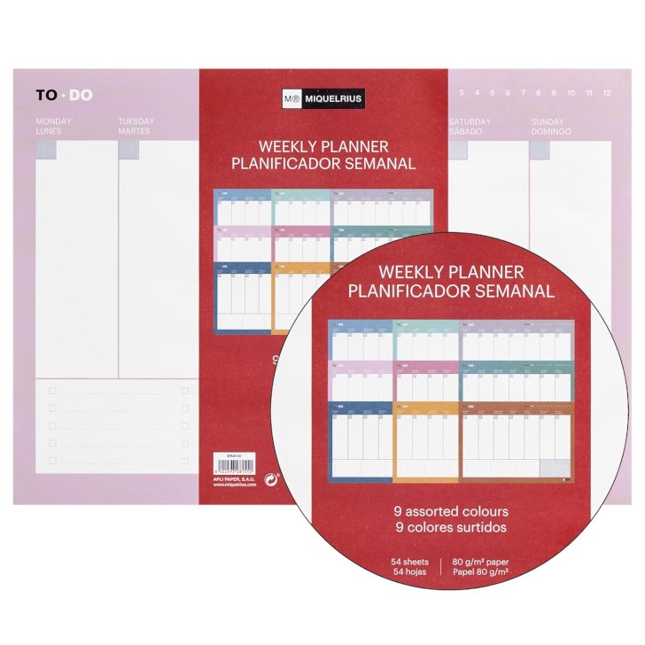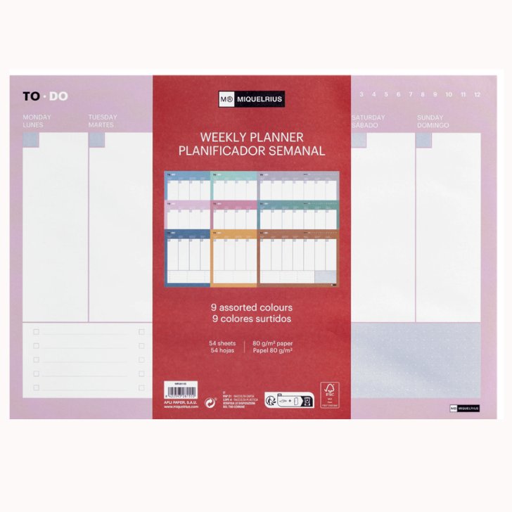 【ミケルリウス 日本公式ショップ】 A4 ウィークリープランナー MIQUELRIUS 9色×各6枚=54枚入り 80g/m2 上質紙 スペイン かわいい おしゃれ シンプル ビジネス 学生 入学 海外 輸入 文具 MR セルフログ スケジュール管理 家族 勉強 計画 受験 日記