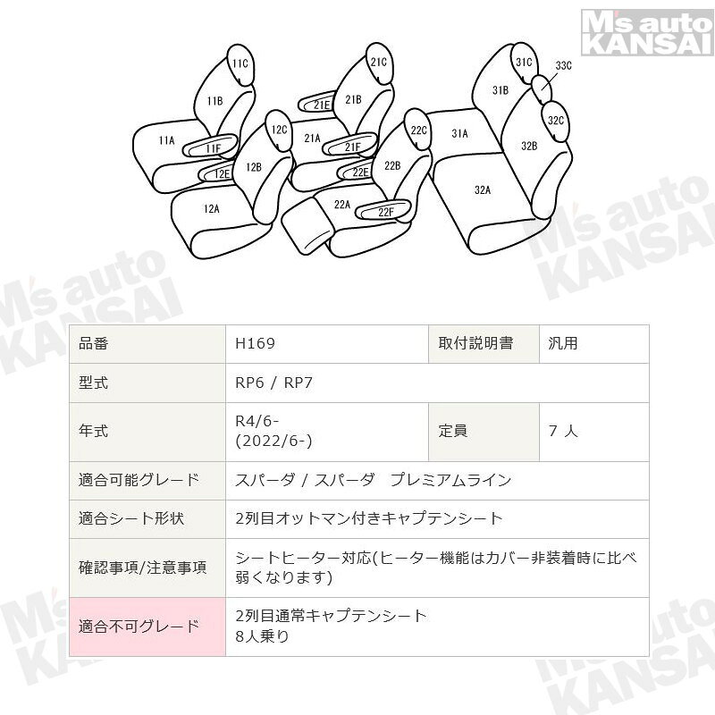 Bellezza Seat Cover 適合車種 品番 H169 車種 ステップワゴン 型式 RP6 / RP7 年式 R4/6- (2022/6-) 定員 7 人 適合可能グレード スパーダ / スパーダ プレミアムライン 適合シート形状 2列目オットマン付きキャプテンシート 確認事項/注意事項 シートヒーター対応(ヒーター機能はカバー非装着時に比べ弱くなります) 適合不可グレード 2列目通常キャプテンシート 8人乗り 年式、グレード等が違うと取付できませんので再度ご確認お願い致します。●●●●● 納期・発送について 納期 在庫のある商品は2営業日前後で発送致します。 欠品、受注生産の商品は1ヵ月-1.5ヵ月のお時間をいただく場合もござます。 お急ぎの方は、お手数ですがご注文前に在庫確認をお願い致します。 送料 (税抜) 運送会社 佐川急便・日本郵便 送料 本州無料 / 北海道・沖縄県 別途必要 ※発送先が離島地域の場合追加料金が必要になりますので、ご注文後別途ご請求いたします。 詳しくはお問い合わせお願い致します。 注意事項・・・必ずお読み下さい。 製品についてのご注意 ●※シートカバーの適合間違いが非常に多くあります。 適合車種が間違っているとシートカバーは取り付け出来ません。 年式、グレード、2列目シート形状等が違うと取り付けが出来ず ご購入いただいたシートカバーが無駄になってしまいます。 適合車種の場合でも年式、グレード等で仕様変更になっている場合が有ります。 営業時間内でしたら、なるべく早くお答えしますので、 車種、型式、年式、グレードをご確認のうえ お気軽に、お問い合わせ下さい。 ●商品画像はイメージ画像のため実際の商品カラー・素材感などは、ご覧いただくモニター等の環境により 違いがありますので予めご了承お願い致します。 キャンセルについて 明らかな欠陥がある場合を除き一旦正式に承った商品についてキャンセル・返品・交換はいたしかねますので 予めご了承お願いします。 商品の納期によるキャンセルは一切受け付けいたしません。 お急ぎの場合は ご注文前に在庫確認をお願いします。 商品の返品、交換について 購入商品の装着後は、いかなる場合も返品、交換の対象になりませんので 必ず取り付け前に検品確認をお願いします。 商品の破損、色違い、商品違いの場合は到着後、1週間以内にご連絡お願いします。 期間を過ぎますとご対応対象外となってしまいますのでご注意下さい。