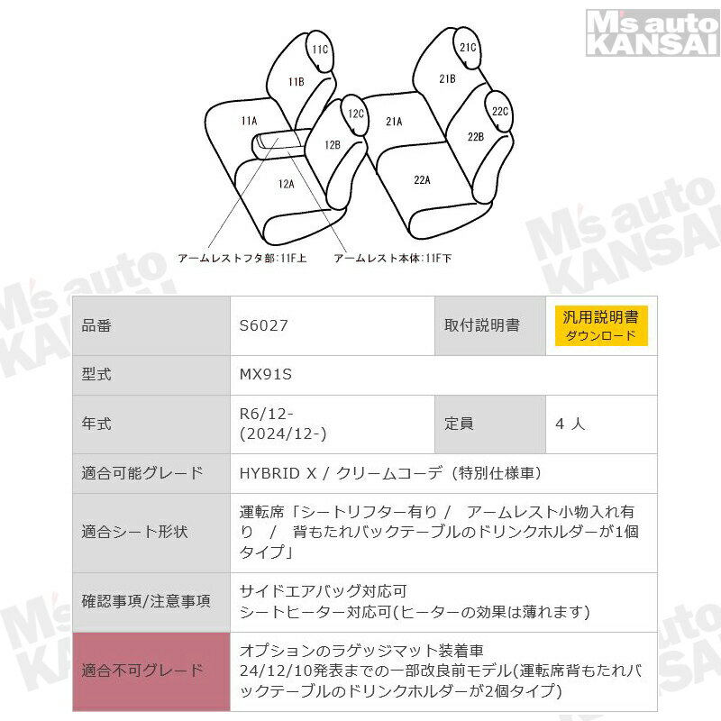 Bellezza Seat Cover 適合車種 品番 S6027 車種 ワゴンRスマイル 型式 MX91S 年式 R6/12- (2024/12-) 定員 4 人 適合可能グレード HYBRID X / クリームコーデ(特別仕様車) 適合シート形状 運転席「シートリフター有り/アームレスト小物入れ有り/背もたれバックテーブルのドリンクホルダーが1個タイプ」 確認事項/注意事項 サイドエアバッグ対応可 シートヒーター対応可(ヒーターの効果は薄れます) 適合不可グレード オプションのラゲッジマット装着車 24/12/10発表までの一部改良前モデル(運転席背もたれバックテーブルのドリンクホルダーが2個タイプ) 年式、グレード等が違うと取付できませんので再度ご確認お願い致します。●●●●● 納期・発送について 納期 在庫のある商品は2営業日前後で発送致します。 欠品、受注生産の商品は1ヵ月-1.5ヵ月のお時間をいただく場合もござます。 お急ぎの方は、お手数ですがご注文前に在庫確認をお願い致します。 送料 (税抜) 運送会社 佐川急便・日本郵便 送料 本州無料 / 北海道・沖縄県 別途必要 ※発送先が離島地域の場合追加料金が必要になりますので、ご注文後別途ご請求いたします。 詳しくはお問い合わせお願い致します。 注意事項・・・必ずお読み下さい。 製品についてのご注意 ●※シートカバーの適合間違いが非常に多くあります。 適合車種が間違っているとシートカバーは取り付け出来ません。 年式、グレード、2列目シート形状等が違うと取り付けが出来ず ご購入いただいたシートカバーが無駄になってしまいます。 適合車種の場合でも年式、グレード等で仕様変更になっている場合が有ります。 営業時間内でしたら、なるべく早くお答えしますので、 車種、型式、年式、グレードをご確認のうえ お気軽に、お問い合わせ下さい。 ●商品画像はイメージ画像のため実際の商品カラー・素材感などは、ご覧いただくモニター等の環境により 違いがありますので予めご了承お願い致します。 キャンセルについて 明らかな欠陥がある場合を除き一旦正式に承った商品についてキャンセル・返品・交換はいたしかねますので 予めご了承お願いします。 商品の納期によるキャンセルは一切受け付けいたしません。 お急ぎの場合は ご注文前に在庫確認をお願いします。 商品の返品、交換について 購入商品の装着後は、いかなる場合も返品、交換の対象になりませんので 必ず取り付け前に検品確認をお願いします。 商品の破損、色違い、商品違いの場合は到着後、1週間以内にご連絡お願いします。 期間を過ぎますとご対応対象外となってしまいますのでご注意下さい。