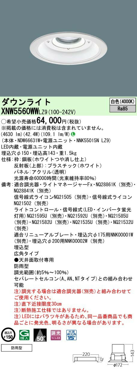 XNW5560WW LZ9 軒下用ダウンライトLED内蔵、電源ユニット内蔵【本体】NDW66631W【電源ユニット】NNK55015N LZ9光源◆LED(白色) ◆色温度:4000 K ◆光源寿命60000時間(光束維持率80%)寸法・質量◆埋込穴径:φ150 mm ◆埋込高:143 mm◆質量:1.5 kg仕様◆器具光束:4630 lm ◆電圧:100〜242 V ◆消費電力:42.4 W ◆消費効率:109.1 lm/W◆【枠】鋼板(ホワイトつや消し仕上)◆【反射板(上部)】プラスチック(ホワイト)◆【パネル】アクリル(透明)◆Ra85【適合リニューアルプレート】埋込穴φ175用NNK00001W (別売)【適合リニューアルプレート】埋込穴φ200用NNK00002W (別売)◆埋込型◆広角タイプ 光源遮光角15度◆●天井面取付専用◆防雨型◆調光範囲(約5%〜100%)◆セパレートセルコン(A、AN、NTタイプ)との組み合わせ可能◆調光する場合は適合調光器(別売)と組み合わせてご使用ください。◆直下近接限度30cm◆断熱施工仕様ではありません。