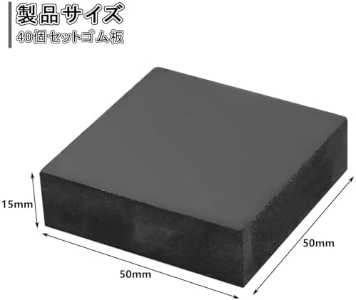 40個セットのゴム板です。サイズは50x50x15mmで、カラーはブラックです。高品質のゴム製で耐久性が優れています。カッターなどで自由に切断可能です。スピーカー、CDプレイヤー、レコードプレイヤー、パワーアンプなどの振動を吸収する緩衝材として使用できます。振動を吸収し、音質が向上します。重量のある家具にも耐えられる硬質なゴム製で、家具の高さ調節に最適です。テーブル、ソファ、テレビ台、キャビネット、ベッドなどの家具を少し高くし、傷を防止します。床やフローリングの傷を防止する滑り止めクッションです。隙間に挟んで使用し、転倒防止や床のキズ防止、地震や振動対策に役立ちます。ゴム素材の臭いが気になる場合は、風通しの良い場所に置いておくと臭いが軽減されます。手作業で裁断しているため、サイズに若干の誤差がある場合があります。40個セットのゴム板です。サイズは50x50x15mmで、カラーはブラックです。高品質のゴム製で耐久性が優れています。カッターなどで自由に切断可能です。スピーカー、CDプレイヤー、レコードプレイヤー、パワーアンプなどの振動を吸収する緩衝材として使用できます。振動を吸収し、音質が向上します。重量のある家具にも耐えられる硬質なゴム製で、家具の高さ調節に最適です。テーブル、ソファ、テレビ台、キャビネット、ベッドなどの家具を少し高くし、傷を防止します。床やフローリングの傷を防止する滑り止めクッションです。隙間に挟んで使用し、転倒防止や床のキズ防止、地震や振動対策に役立ちます。ゴム素材の臭いが気になる場合は、風通しの良い場所に置いておくと臭いが軽減されます。手作業で裁断しているため、サイズに若干の誤差がある場合があります。