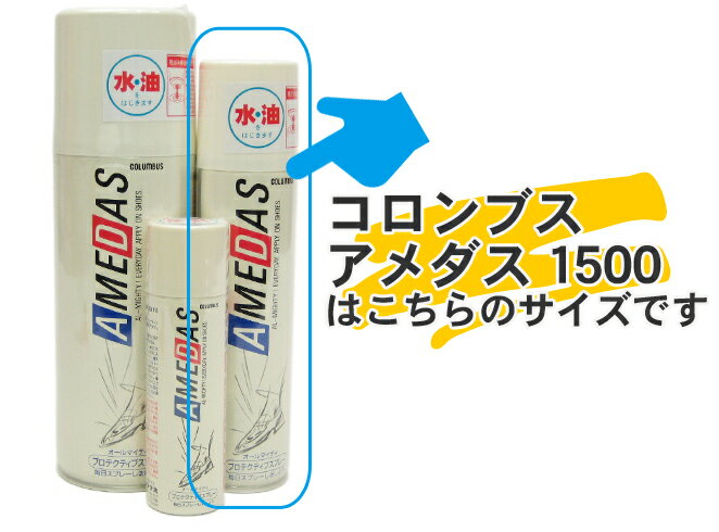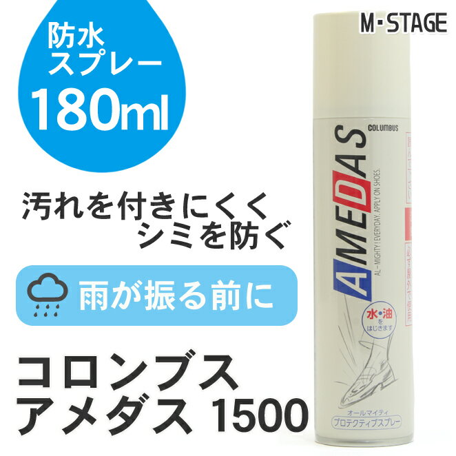 【コロンブス 防水スプレー アメダス1500(180ml)】 ツヤ革、起毛革(スエード・ヌバック等)等の天然皮革の靴だけでなく、その他の革製品、布地、人工皮革等の靴およびその他製品などに使用できます。フッ素樹脂が通気性を損なうことなく防水・撥油・防汚効果を与えます。 【商品説明】 ●フッ素樹脂が通気性を損なうことなく防水・撥油・防汚効果を与えます。 ●ツヤ革、起毛革等の天然皮革靴やその他の革製品、布地、人工皮革にも使えます。 ●フッ素樹脂・石油系炭化水素 第4類第1石油類298ml 危険等級2 ■容量:180ml ■発送不可地域について こちらの商品は航空法により空輸便でのお届けができないため、お届け先が離島・沖縄県の場合、ご注文をキャンセルとさせていただきます。予めご了承くださいませ。大きさ3種類 アメダス防水スプレー 大容量サイズ! 大(420ml) 標準サイズ! 中(180ml) 携帯に便利なミニサイズ! 小(60ml)