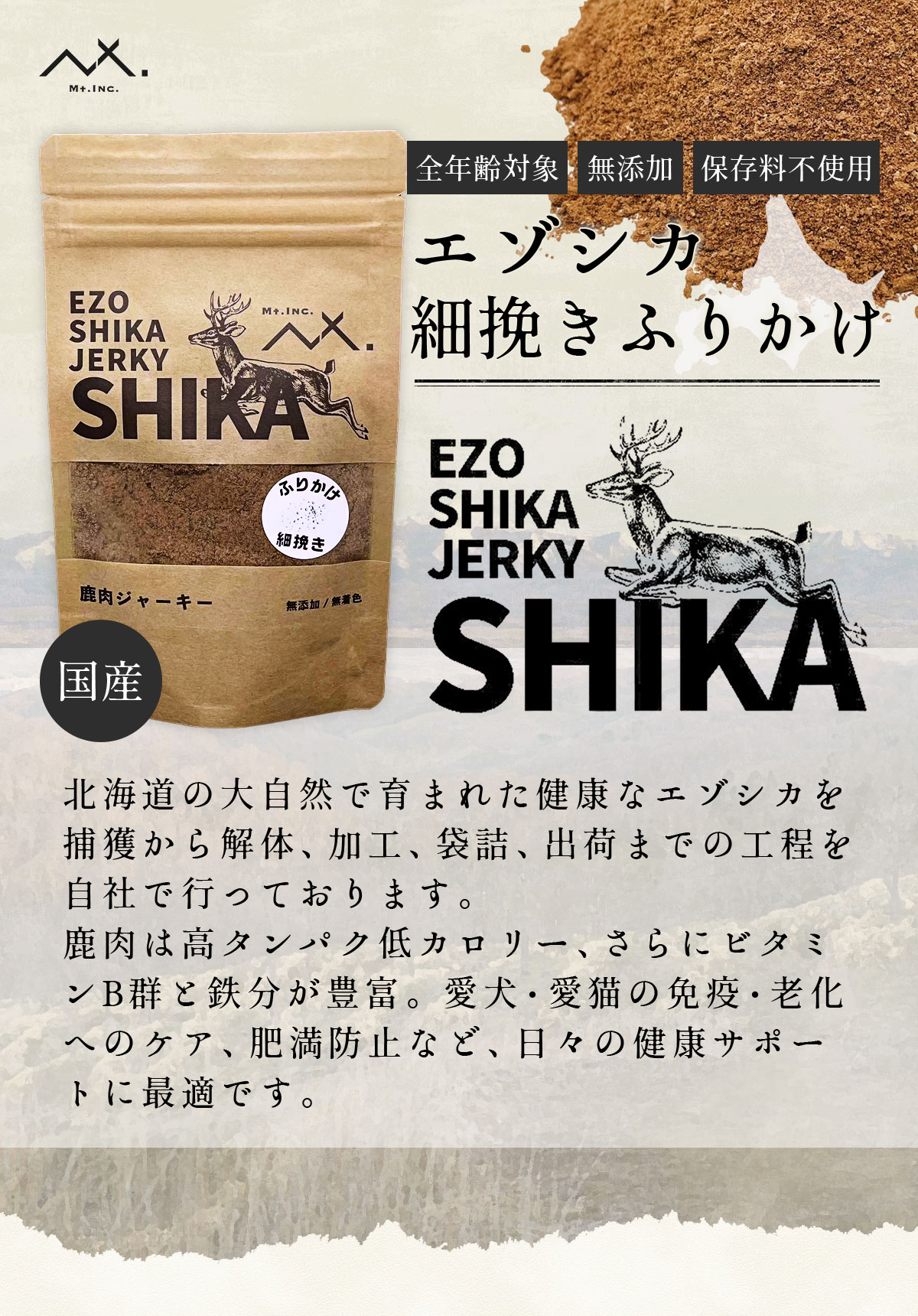 〈細挽きふりかけ 50g〉 鹿肉 犬 ふりかけ 犬用ふりかけ 鹿 肉 犬用 国産 無添加 パウダー 餌 エゾ鹿 肉 犬 エゾシカ肉 エゾシカ おやつ ごはん シカ肉 犬 餌 犬のおやつ 犬用おやつ 犬おやつ 鹿肉ドッグフード