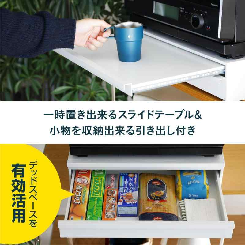 シービージャパン レンジラック 【完成品】 ホワイト 幅50×奥行40.5×高10.8cm キッチン家電下ラック レンジ下収納 家電ラック スライドテーブル 引出し付き comtoolキッチンに新たな収納スペースを作り出す「キッチン家電ラック スライドテーブル&引出し付き」電子レンジや炊飯器などの下に設置することで、デッドスペースを有効活用できます上の段はスライドテーブルになっており、食器や調理する前の食材、電子レンジなどの家電から取り出した食材を一時置きするのに便利。スライドテーブルと引出しには「スライドレール」が付いているので、スムーズに開閉出来ます下の段は引出しタイプの収納になっているので、キッチンツールやミトン、サランラップなどの小物や、レシピブックなどを保管しておくのもおすすめ本商品の上に積載物(5kg以上20kg未満)がない状態で、スライドテーブル及び引出しを使用しないでくださいキッチン家電のサイズによっては使えない場合もございます。あらかじめサイズを確認してからご使用ください