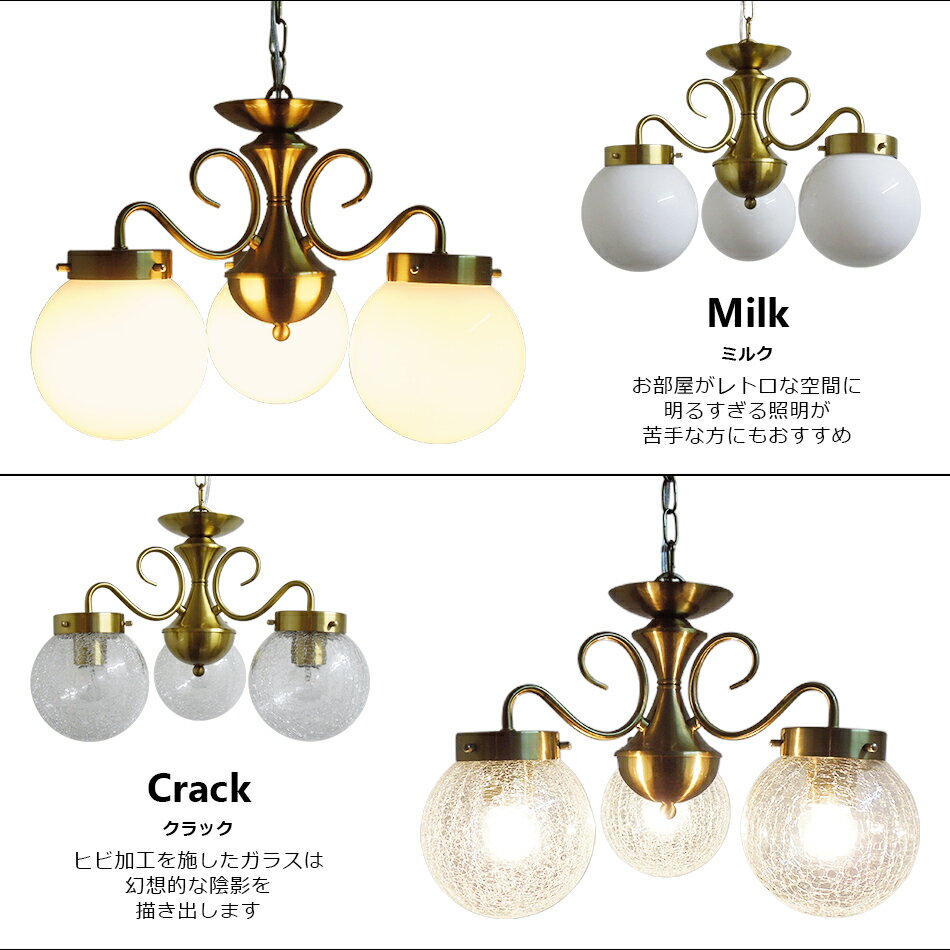 点灯・消灯・ガラスシェードによってイメージががらりと変わるリプロダクト3灯ペンダントライト 商品名 3灯 ペンダントライト Claudia (クローディア) ガラスシェードタイプ クリア、ミルク、クラック 素材 ガラス、スチール 本体サイズ(約) H350×Φ440mm ※カップとチェーン以外のサイズ カップの高さ(約) 210mm チェーンの長さ(約) 500mm/チェーン最短100mm(最短全長660mm) ※チェーンカットはこちら ※チェーンの長さ調整はこちら 重量(約) 2.8kg ※クラックのみ3.2kg 電球 E-26 白熱ボール球 3本付属 (ワット数上限:1灯あたり40Wまで)LED対応(※E-26のガラスに入るサイズのLED電球をご用意ください) プラグ 引っ掛けシーリング スイッチ 壁スイッチ(ON/OFF) ※本体にスイッチはついておりません。 ご確認 ・白熱電球は熱くなる為、ご注意ください。 ・LED電球対応。E26口金サイズ、ガラスシェードに入るサイズの電球をご用意ください。 ・当店ではE26 LED電球のご用意がない為、他メーカー様からご購入ください。