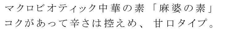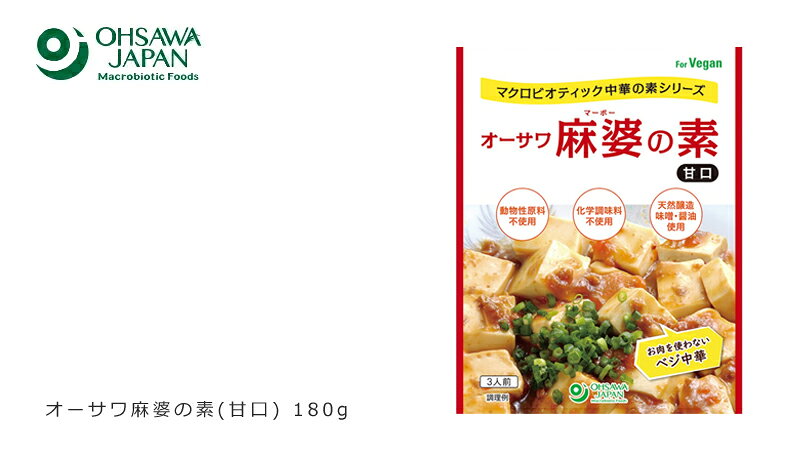商品詳細名称 オーサワ麻婆の素(甘口) 原材料昆布だし、オーサワのベジミート穀物で作った畑の肉、特別栽培にんじん(国産)、味噌、醤油、米飴、馬鈴薯でん粉、オーサワのりんごジュース、老酒、なたね油、メープルシュガー、おろし生姜[生姜(国産)]、おろしにんにく[にんにく(中国産)]、酵母エキス、食塩(海の精)、昆布粉末、赤唐辛子(中国産)内容量 180g原産国日本製造者(メーカー) オーサワジャパン株式会社■「オーサワのベジミート穀物で作った畑の肉(ひき肉タイプ)」使用 ■豆腐を加えて炒めるだけで麻婆豆腐が作れます ■国内産丸大豆使用の醤油・味噌使用、醸造調味料使用 ■辛さ控えめなので、お子様でも食べやすい ■麻婆茄子や麻婆春雨にも ■砂糖・動物性原料・不使用 ■3人前 【用途】中華の素(麻婆の素・甘口) 昆布だし、オーサワのベジミート穀物で作った畑の肉、特別栽培にんじん(国産)、味噌、醤油、米飴、馬鈴薯でん粉、オーサワのりんごジュース、老酒、なたね油、メープルシュガー、おろし生姜[生姜(国産)]、おろしにんにく[にんにく(中国産)]、酵母エキス、食塩(海の精)、昆布粉末、赤唐辛子(中国産) 【商品名】 オーサワ麻婆の素(甘口) 【内容量】 180g 【製造元】 オーサワジャパン株式会社 【広告文責】 株式会社麦心 0574-66-5501 砂糖・動物性原料・不使用。安心素材の麻婆豆腐の素。お豆腐を入れるだけでという手軽さで、おいしいマクロビ対応のご飯が作れます。 1.よく熱した中華鍋、またはフライパンに本品を加えます。 2.水切りして、さいの目に切った豆腐(1丁)を加え、中火で温めます。 3.お好みに応じてみじん切りにした長ねぎを加え、煮立ったら火を止めて出来上がり。