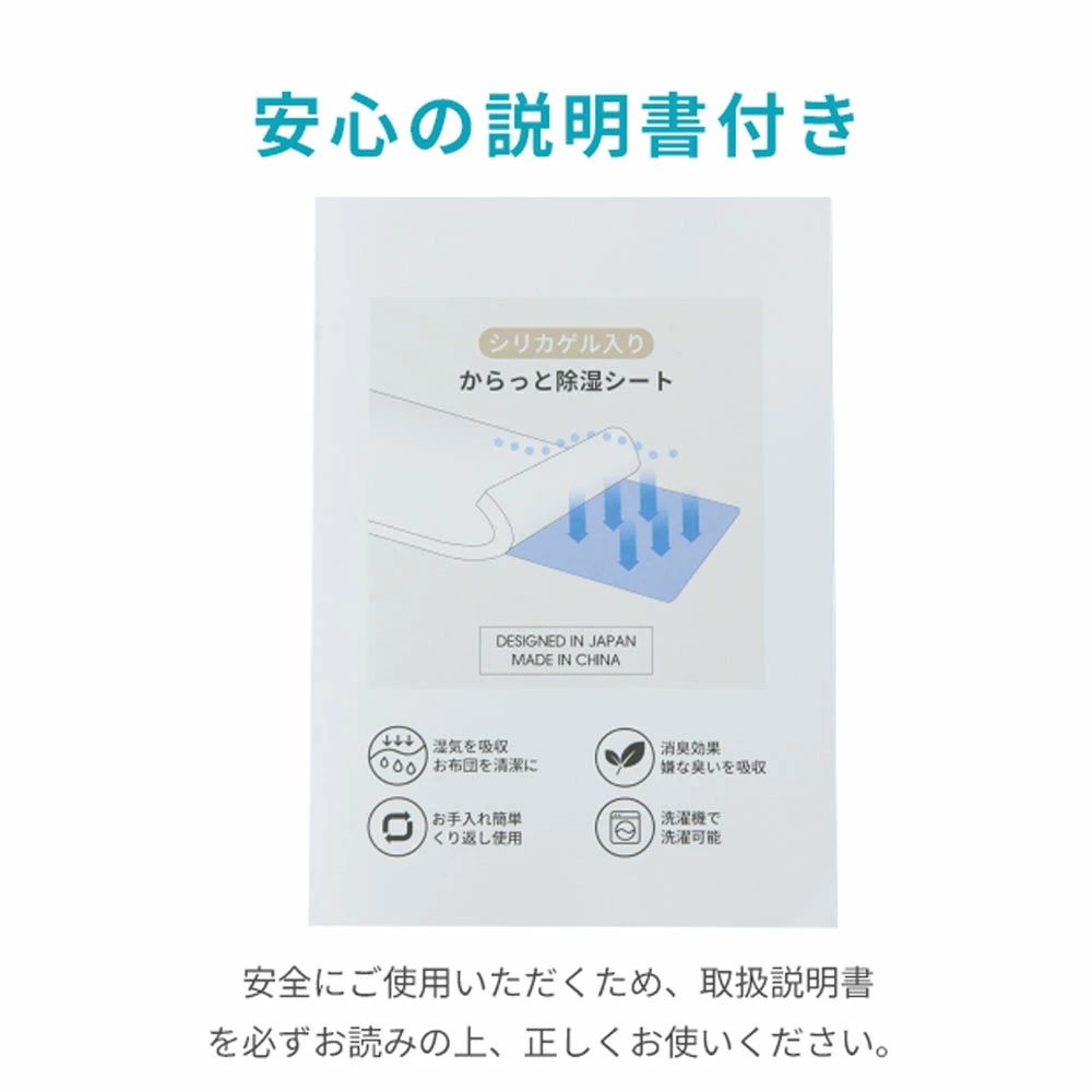 【グングン湿気を吸収】中材には高性能シリカゲルBタイプを採用。床から上がる湿気や寝汗など、布団の中にこもる湿気をしっかり吸収し、ジメジメ感を軽減します。布団が干せない日でもサラッと快適。梅雨や夏の寝汗、冬の結露対策にも一年中活躍します。※吸湿量(シングルサイズ):約2800cc(500mlペットボトル約6本分)【除湿+消臭+防カビ+防ダニで快適】湿度60%を超えると、カビやダニが発生しやすくなると言われています。本製品は寝具の下に敷くだけで湿気をぐんぐん吸収し、カビやダニが好む環境をブロック。さらに中材に竹炭を配合することで、汗や蒸れによる不快なニオイを吸着・分解し、消臭効果をプラスしました。重たい布団を干す手間を減らしながら、除湿と消臭のダブル効果で一年中さらっと快適に。【吸湿センサー付きでお手入れ簡単】吸湿センサーがブルーからピンクに変わったら、干し時のサイン。風通しの良い場所に干すだけで吸湿力が復活し、繰り返し使えて経済的&エコ。さらに本体はご家庭で丸洗いOK(※洗濯前にセンサーを取り外してください)。いつでも清潔にお使いいただけます。【幅広いシーンで活躍】ベッドや床、敷き布団、マットレスなどさまざまな寝具に対応。マットレスの上に敷き、その上からシーツや敷きパッドを重ねるだけで簡単に使用できます。布団の場合は床→除湿シート→敷き布団の順にセット。押し入れや布団収納時の湿気対策にも便利です。【商品仕様】材質:表生地/ポリエステル100% 裏生地/ポリエステル100% 中材/シリカゲルBタイプ(吸湿センサー付き)原産国:中国※環境に配慮した簡易包装(薄型フィルム)でお届けします。※モニター環境により、実際の色味と異なる場合があります。※商品のパッケージやラベルに記載されている会社名はブランド名と異なる場合があります。【グングン湿気を吸収】中材には高性能シリカゲルBタイプを採用。床から上がる湿気や寝汗など、布団の中にこもる湿気をしっかり吸収し、ジメジメ感を軽減します。布団が干せない日でもサラッと快適。梅雨や夏の寝汗、冬の結露対策にも一年中活躍します。※吸湿量(シングルサイズ):約2800cc(500mlペットボトル約6本分)【除湿+消臭+防カビ+防ダニで快適】湿度60%を超えると、カビやダニが発生しやすくなると言われています。本製品は寝具の下に敷くだけで湿気をぐんぐん吸収し、カビやダニが好む環境をブロック。さらに中材に竹炭を配合することで、汗や蒸れによる不快なニオイを吸着・分解し、消臭効果をプラスしました。重たい布団を干す手間を減らしながら、除湿と消臭のダブル効果で一年中さらっと快適に。【吸湿センサー付きでお手入れ簡単】吸湿センサーがブルーからピンクに変わったら、干し時のサイン。風通しの良い場所に干すだけで吸湿力が復活し、繰り返し使えて経済的&エコ。さらに本体はご家庭で丸洗いOK(※洗濯前にセンサーを取り外してください)。いつでも清潔にお使いいただけます。【幅広いシーンで活躍】ベッドや床、敷き布団、マットレスなどさまざまな寝具に対応。マットレスの上に敷き、その上からシーツや敷きパッドを重ねるだけで簡単に使用できます。布団の場合は床→除湿シート→敷き布団の順にセット。押し入れや布団収納時の湿気対策にも便利です。【商品仕様】材質:表生地/ポリエステル100% 裏生地/ポリエステル100% 中材/シリカゲルBタイプ(吸湿センサー付き)原産国:中国※環境に配慮した簡易包装(薄型フィルム)でお届けします。※モニター環境により、実際の色味と異なる場合があります。※商品のパッケージやラベルに記載されている会社名はブランド名と異なる場合があります。
