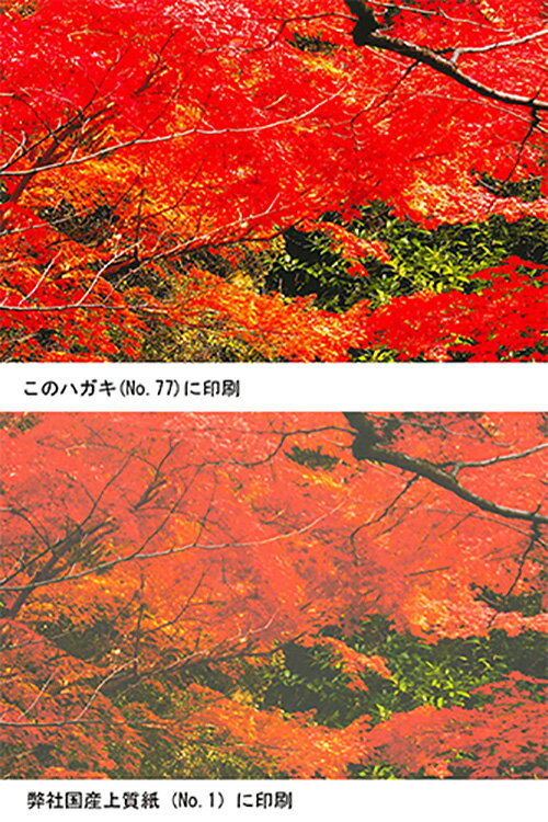 ☆No.77を100枚に小分けしたものです。 -------------------- 大口包装にしたものもございます。 100枚よりもお得になります、沢山ご必要な方はご利用下さい。 1,000枚入り -------------------- 左のふたつの写真を見比べてください! このハガキは「IJハイブリッドW・180kg・四六版」という紙を使用しております。 少々古いプリンターでも紙すべりが非常に少ないのが特徴です。 国産上質紙では四六判にて180kgに相当する紙の厚さですのでしっかりとした厚みと質感があります。 *格調高いマット調の肌合い。 *自然な高白色度。 *優れたビジュアル印刷適性及びハイグレードなIJ印字適性。 *印刷面に重ねてインクジェット印字が可能。 *ボールペン書き適性にも優れています。 インクジェットプリンターでよく写真を印刷されるにはもってこいのハガキです。 もちろん、表も裏もインクジェット対応ですので安心してお使いになれます。 色:白色 サイズ:100mm x 148mm 発色はすばらしく、レーザプリンタで印刷したように綺麗にプリント出来ます。 紙の厚さは官製ハガキより少し厚くてコシもあり、しっかりした質感のハガキです。 光沢紙ではありませんが、普通紙では最高の画質を提供いたします。 *ご注意 インクジェット対応紙にありがちな紙すべりがほとんどありませんが、プリンターのローラー部分の手入れはお勧めいたします。 また、レーザープリンタには絶対に使用しないで下さい。
