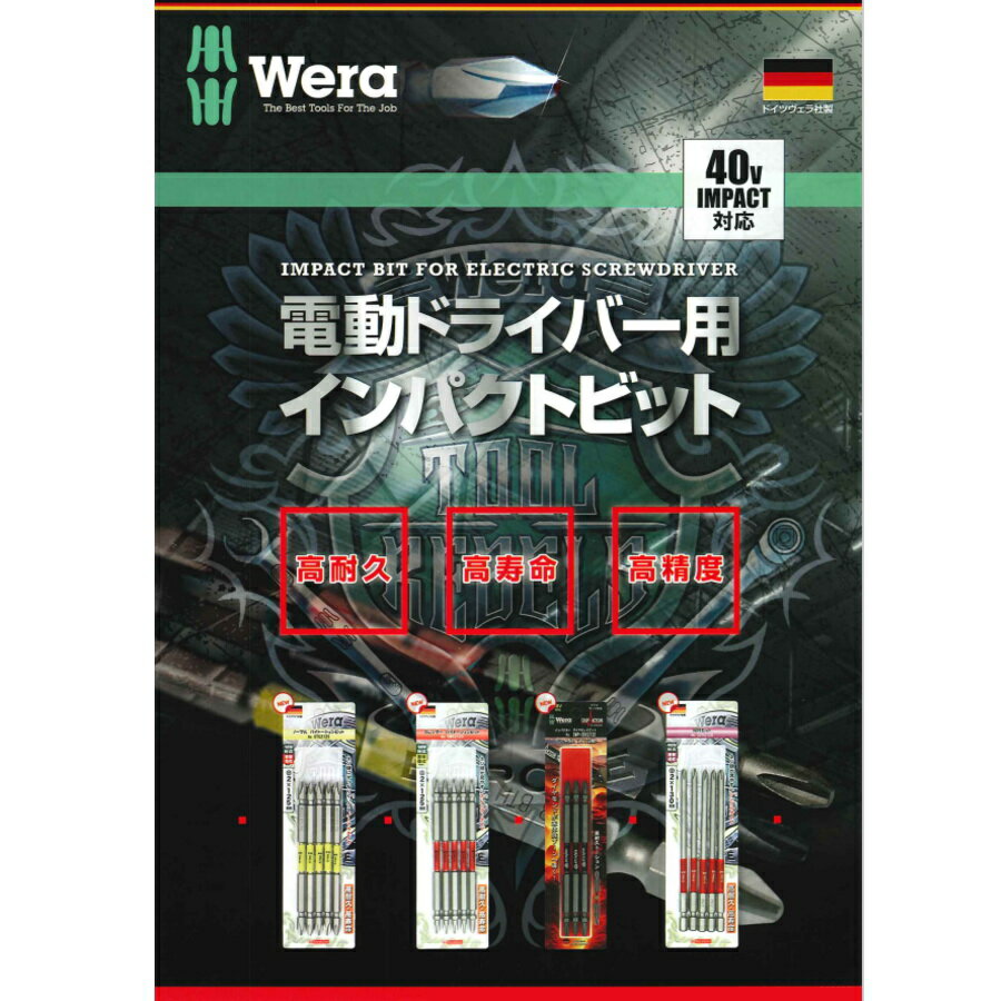 注意事項:モニターの発色により、実物と異なる場合がございます。 WERA電動ドライバー用インパクトビット 高耐久・高寿命・高精度 プロ仕様の究極のビットシリーズ。 長い目で考えるとWERAビットシリーズが弊社の最推しビットです。 商品は5種類のラインナップでご用意 ・ノーマルバイトーションビット 品番:TS- 【TS2065】 +2×65mm 2本入り 【TS2110】 +2×110mm 2本入り 【TS1110】 +1×110mm 2本入り 【TS3110】 +3×110mm 2本入り 【TS2125】 +2×125mm 2本入り 【TS2150】 +2×150mm 2本入り 【5TS2065】 +2×65mm 5本入り 【5TS2110】 +2×110mm 5本入り 【5TS2125】 +2×125mm 5本入り 【5TS2000】 +2×65mm 2本/+2×110mm 3本入り ・インパクターダイヤモンドビット 品番:IMP- 【IMP-DC2065】 +2×65mm 1本入り 【IMP-DC2085】 +2×85mm 1本入り 【IMP-DC2110】 +2×110mm 1本入り 【IMP-DC2125】 +2×125mm 1本入り 【IMP-3DC2065】 +2×65mm 3本入り 【IMP-3DC2085】 +2×85mm 3本入り 【IMP-3DC2110】 +2×110mm 3本入り 【IMP-3DC2125】 +2×125mm 3本入り ・段付きビット 品番:DS- 【DS2100】 +2×100mm 2本入り 【DS2130】 +2×130mm 2本入り 【DS2150】 +2×150mm 2本入り 【5DS2100】 +2×100mm 5本入り 【5DS2130】 +2×130mm 5本入り ・スレンダーバイトーションビット 品番:WS- 【WS2065】 +2×65mm 2本入り 【WS2085】 +2×85mm 2本入り 【WS2110】 +2×110mm 2本入り 【WS2125】 +2×125mm 2本入り 【WS2150】 +2×150mm 2本入り 【5WS2065】 +2×65mm 5本入り 【5WS2085】 +2×85mm 5本入り 【5WS2110】 +2×110mm 5本入り 【5WS2125】 +2×125mm 5本入り 【5WS2000】 +2×65mm 2本 /+2×110mm 3本入り ・完全ビットセット 品番:KB- 【KB065SET】 +2×65mmノーマルバイトーション1本 / +2×65mmインパクターダイヤモンド1本 / 2×65mm スレンダーバイトーション2本 / +2×85mmスレンダーバイトーション1本 【KB110SET】 +2×110mmノーマルバイトーション1本 / +2×110mmインパクターダイヤモンド1本 / 2×110mm スレンダーバイトーション2本 / +2×85mmスレンダーバイトーション1本