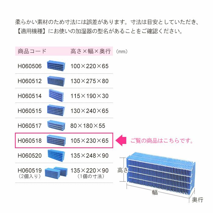 「H060509抗菌気化フィルター」と「H060511抗菌気化フィルター」は「H060518抗菌気化フィルター」に統合となりました。抗菌気化フィルターは、5シーズンを目安に新しいもの(別売品)と交換してください。 (1シーズン6ヶ月、1日8時間運転、水道水の硬度50mg/L(全国平均値)、月に1回クエン酸洗浄した場合)。 クエン酸洗浄なしでは1シーズンです。なお、水道水の硬度の違いにより寿命が短くなる場合があります。 また、5シーズン以内でも汚れや水アカが落ちなくなったり、傷みや型くずれがひどいときは交換してください。※適用機種にご注意くださいお手入れタイプのフィルターです。適用機種の抗菌気化フィルターは2つのタイプから選べます。【使い捨てタイプのフィルター(赤紫)】【お手入れタイプのフィルター】フィルター交換の期間は最大5シーズン※1※1:1シーズンを6カ月、1日8時間運転、水道水の硬度50mg/L(全国平均値)、月に1回クエン酸洗浄した場合。クエン酸で洗浄せずに使用を続けると寿命が短くなり、1シーズンに満たなくても交換が必要になる場合があります。また、交換のめやす期間以内でも汚れや水アカが落ちなくなったり、傷みや型くずれがひどいときは交換してください。なお、水道水の硬度の違いにより寿命が短くなる場合があります。●加湿器のフィルターは純正品をご使用ください。ダイニチ製を模した安価なコピー商品の流通を確認しています。純正品ではないフィルターを使用した場合、規定量の湿度に上がらない等、加湿器本来の性能を発揮できません。また、純正品以外のフィルターのご使用による不具合への対応については、保証期間内であっても有償となります。 商品情報 【適用機種】HD-500A,HD-500B,HD-500C,HD-500D,HD-500E,HD-500F,HD-5011,HD-5012,HD-5013,HD-5014,HD-5015,HD-5015E3,HD-5016,HD-5016E4,HD-5017,HD-5017E5,HD-5018,HD-5018E6,HD-5019,HD-5020,HD-5021,HD-5022,HD-700C,HD-700D,HD-700E,HD-700F,HD-7011,HD-7012,HD-7013,HD-7014 HD-7015,HD-7016,HD-7017,HD-7018,HD-7019,HD-7020,HD-7021,HD-7022,HD-900C,HD-900D,HD-900E,HD-900F,HD-9014,HD-9015,HD-9016,HD-9017,HD-9018,HD-9019,HD-9020,HD-9021,HD-9022,HD-C500G,HD-C500H,HD-C700G,HD-C700H,HD-C900G,HD-C900H,HD-ERXT501,HD-ERXT502,HD-ERXT902 HD-KS5017,HD-KSRX518,HD-KSRX519,HD-KSRX520,HD-KSRX718,HD-KSRX719,HD-KSRX720,HD-KSRX918,HD-KSRX919,HD-KSRX920,HD-N523,HD-N524,HD-N525,HD-N723,HD-N724,HD-N725,HD-N923,HD-N924,HD-N925,HD-RX500A,HD-RX511,HD-RX512,HD-RX513,HD-RX514,HD-RX515,HD-RX516,HD-RX517 HD-RX518,HD-RX519,HD-RX519E7,HD-RX520,HD-RX520E8,HD-RX700A,HD-RX711,HD-RX712,HD-RX713,HD-RX714,HD-RX715,HD-RX716,HD-RX717,HD-RX718,HD-RX718E6,HD-RX719,HD-RX719E7,HD-RX720,HD-RX720E8,HD-RX900A,HD-RX911,HD-RX912,HD-RX913,HD-RX914,HD-RX915,HD-RX916,HD-RX917 HD-RX918,HD-RX918E6,HD-RX919,HD-RX919E7,HD-RX920,HD-RX920E8,HD-RXC500B,HD-RXC500C,HD-RXC700B,HD-RXC700C,HD-RXC900B,HD-RXC900C,HD-RXT521,HD-RXT521E9,HD-RXT522,HD-RXT522E2,HD-RXT523,HD-RXT523E3,HD-RXT524,HD-RXT524E4,HD-RXT525,HD-RXT525E5,HD-RXT721 HD-RXT721E9,HD-RXT722,HD-RXT722E2,HD-RXT723,HD-RXT723E3,HD-RXT724,HD-RXT724E4,HD-RXT725,HD-RXT725E5,HD-RXT921,HD-RXT921E9,HD-RXT922,HD-RXT922E2,HD-RXT923,HD-RXT923E3,HD-RXT924,HD-RXT924E4,HD-RXT925,HD-RXT925E5サイズ105×230×65 H060518