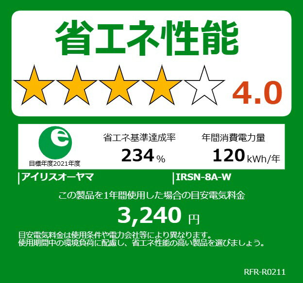飲料品などをたっぷり収納でき、広くて使いやすさ抜群です。・ 500mlペットボトルだと37本収納が可能です。・ 3段ガラス棚と庫内が見やすい透明なケースなので、取り出しもスムーズにできます。・ 霜取り不要の、自動霜取り機能が搭載されています。・ トップテーブルは、耐熱温度100℃、耐荷重は30kgなので、上部を有効活用できます。・ 庫内のガラス棚とケースは取り外し可能なので、掃除も楽にできます。・ オフィスにおいて従業員や来客用の飲料の保存にも適した冷蔵庫です。・ セカンド冷蔵庫としても利用可能です。定格内容積“80L”のスリム冷蔵庫。幅約“35.6cm”でちょっとしたスペースに置けるスリムタイプだから、サブ冷蔵庫にぴったり。まとめ買いのストックなど、冷蔵庫の「ちょっと足りない」をサポート。[壁もスリムに]壁も薄く約“34mm”。壁を薄型にすることで、容量をキープしながらさらなるスリム化を実現![オフィスにも]来客用のお茶出しも、ペットボトルでの提供に変わりつつあります。置きやすいサイズの冷蔵庫はオフィスに1台あると便利です。[耐熱トップテーブル]耐熱温度約100℃/耐荷重約30kg。電子レンジなどを置いて、キッチンスペースを有効活用できます。◆まとめ買いもおまかせ整頓しやすくスリムに収納“80L”。整理整頓に便利な3段の棚と2段の引き出し付き。たっぷり買っても、しっかりストックできる。◆たっぷり入れても、すぐに見つかる前開き式&クリアケースタイプ。中身が一目で確認できます。(棚×3、ケース×1、底ケース×1)◆食品をすっきり整理整頓サイズの異なるケースに様々な食品を収納できます。◆温度調節5段階(強:5〜弱:1)食品の量や周囲の温度に応じて、冷却運転の強さを調節できます。・1〜2:3より2〜3℃低くなります。・3:約3〜6℃(※周囲温度約32℃、食品を入れずにドアを閉め、安定したときの目安)・4〜5:3より2〜3℃低くなります。◆ファン式自動霜取り庫内に冷気を循環させることで冷却します。自動で霜取りを行うので、霜取りの手間がかかりません。◆いつでもキレイケースは水洗い可能。◆庫内灯庫内を明るく照らす、LED庫内灯付き。◆優れた省エネ性能毎日使うものだから、省エネ性能にもこだわりました。◆静音設計約27db(※JIS C 9607規定の騒音試験による。周囲温度20℃、安定運転時。)キッチンやダイニングに置いても、音が気になりにくい。◆転倒防止市販の転倒防止ベルトを取り付けて壁に固定できます。(ベルト取り付け部:本体背面) 商品情報 色ホワイト定格内容量(L)80定格消費電力(W)(50/60Hz)105本体サイズ(W×D×H)(mm)356×555×996質量(kg)29電源コード(m)約1.9 IRSN8A