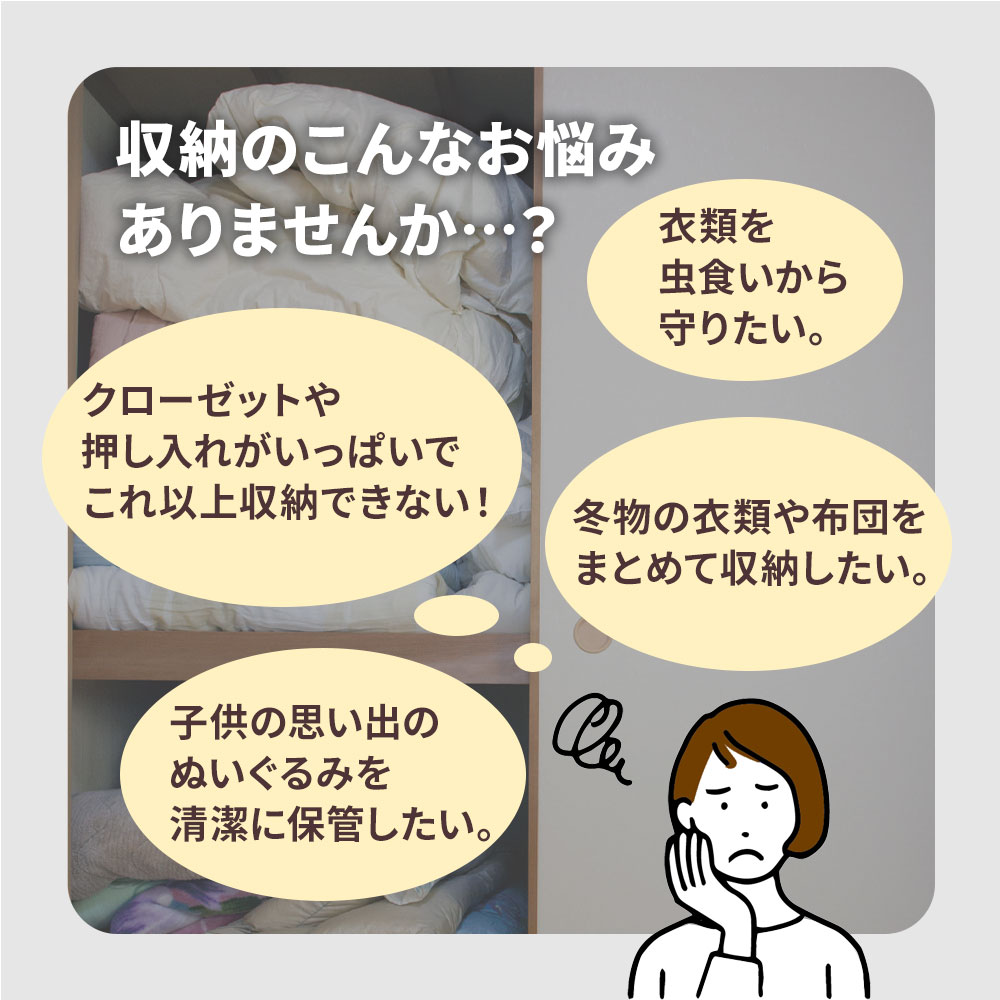 商品情報 詳細 ●おしゃれな窓付き収納ボックスに圧縮袋が内蔵された大容量かつ見せる収納ボックス!ベッド下のごちゃごちゃや見栄えも解消。 ●収納ボックスは底面、側面に型紙が内蔵されているので、収納物に関係なく形を保ち、横置きで重ねたり、縦置きも可能。 ●長期保管も安心の専用の抗菌防臭防ダニシート付き。 ●布団はもちろん、こたつ布団、座布団、カーペット、厚手の衣類からぬいぐるみなど全部圧縮して押入れを整理整頓。圧縮袋を使って約1/3まで圧縮できるから押入れも収納力アップ。圧縮することで湿気もシャットアウトできるから長期間の保管も心配無用。 サイズ <収納ボックス> 【サイズ・重量(約)】幅70×奥行40×高さ30cm、840g 【素材】<側地>不織布(ポリプロピレン)、コートボール紙<窓部>PVC ◎中国製 <圧縮袋> 【サイズ】110×110×マチ40cm 【素材】<本体>ナイロン(特殊ポリエチレン)<バルブ>ポリエチレン<弁パッキン>NBR ◎中国製 <スライダー> 【材質】ポリエチレン <抗菌防ダニシート> 【サイズ・重量(約)】40×60cm、10g 【素材】不織布(ポリエチレン) ◎日本製 収納の目安 ・シングルサイズ掛けふとんの場合…約2~3枚 ・ダブルサイズ掛けふとんの場合…約1~2枚 ・シングルサイズ羽毛ふとんの場合…約2~3枚 ・ダブルサイズ羽毛ふとんの場合…約1~2枚 ・セーター・トレーナー等の場合…約20枚~30枚 ※あくまでも目安となります。 使用上の注意 ●お手入れの不十分なものを収納しますと、圧縮袋のファスナー、バルブ部分、フィルム内面など密閉する為の主要部分にゴミやほこり、髪の毛などが付着しこれらが密閉を阻害し空気が入ってしまう事が起こります。 また臭いの発生する原因にもなりますので、圧縮収納する際は収納物を十分にお手入れしてから行なってください。 ●圧縮袋に傷、穴をあけてしまった場合そこから空気が漏れていることがあります。穴をセロテープなどでふさいでいただければ再度ご使用できます。 ●ファスナーを閉じる時は必ずスライダーをご利用ください。指だけの作業では空気がはいってしまいしっかり圧縮で きません。また、ファスナーのかたよりが起こりやすく、ファスナー端部で片方のファスナーが余る可能性があります。 ●ふとん圧縮袋は本来の使用目的以外のご使用は絶対にしないでください。 ●圧縮袋を熱や火に近づけたり、刃物や突起物で傷つけないようにしてください。 ●ノンダスト布団(ほこりの出ないふとん)は、製品の機能上、中綿及び側生地の密度が高く空気抜けが悪い為、圧縮できません。 ●掃除機のホース先端が平らな形状でないものは、ご使用できない場合がございます。また国外製の掃除機には一部、掃除機のノズル径が細いものがあり、バルブ部分に適合しない場合がありますのでホースもしくはノズル先端の内径が35mm以上である事を確認の上ご利用ください。 マーフィーショップ ※検索用※ 圧縮 収納 圧縮袋 衣類 ひとつ 一体型ボックス 衣類圧縮袋 衣類圧縮袋収納ボックス 圧縮ボックス 圧縮袋一体型BOX 衣類収納袋 スペース 収納ボックス 衣類収納 ぬいぐるみ ゆとり 圧縮収納ケース 圧縮袋付き収納ケース 大物 布 洋服 ラク 取っ手付き 押し入れ収納 押入れ収納 洋服収納 窓付き収納ボックス 衣類収納ボックス 衣類用 クローゼット 不織布 収納BOX 洋服収納袋 衣装 衣類収納ケース 雑貨 インテリア アイデア商品 アイデアグッズ 衣替え 省スペース 圧縮袋 ふとん Q-PON 一人暮らし 布団 収納袋 簡単 圧縮