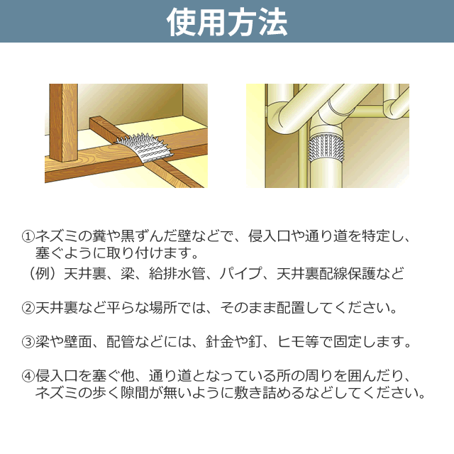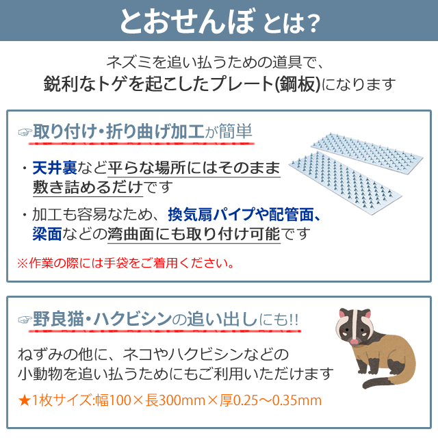 とおせんぼとは? ネズミを追い払うための道具(ネズミ忌避具)です。鋭利なトゲを起こしたプレート(鋼板)になります。 ネズミの忌避(侵入防止)や、ネズミが棲みにくい環境を作り出す(追い出す)のが目的です。 ネズミはトゲに触れて痛さを体験・学習することによって「とおせんぼ」に近寄らなくなります。ネズミが自由自在に動き回れず、屋内に侵入・住み着いたネズミを追い払います。 ★ねずみの他に、ネコなどの小動物を追い払うためにもご利用いただけます。 ★1枚サイズ:幅100×長300mm×厚0.25〜0.35mm 取り付け、折り曲げ加工が簡単 天井裏など平らな場所にはそのまま「とおせんぼ」を敷き詰めるだけで作業は非常に簡単です。 り曲げるなど加工も容易にできるため、ネズミの通り道となりやすい換気扇パイプや配管面、梁面などの湾曲面にも簡単に取り付けることができます。 効果が持続しやすい物理的防除法 とおせんぼは、捕獲や殺鼠剤による駆除とは異なり、追い払うだけの物理的な防除方法(忌避)です。 ネズミは「とおせんぼ」のトゲに慣れませんので、一度取り付ければ効果は半永久的に持続します。経済性にも優れています。また火災の心配がなく、面倒な後始末も不要です。 本品はネズミの忌避や、ネズミが棲めない環境を作り出すのが目的です。 ※取り付け場所の選択および取り付け方法によって効果に影響します。そのため、設置場所には十分な検討が必要となります。 (1)ネズミの糞や黒ずんだ壁などで、侵入口や通り道を特定し、塞ぐように取り付けます。 (例)天井裏、梁、給排水管、パイプ、天井裏配線保護など (2)天井裏など平らな場所では、そのまま配置してください。 (3)梁や壁面、配管などには、針金や釘、ヒモ等で固定します。 (4)侵入口を塞ぐ他、通り道となっている所の周りを囲んだり、ネズミの歩く隙間が無いように敷き詰めるなどしてください。 ページTOPへ