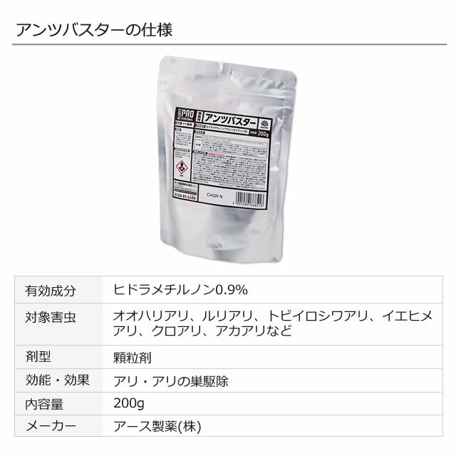 業務用アリ駆除剤 アンツバスター 200g 顆粒タイプ 毒餌 巣持ち帰り 巣ごと駆除 プロ仕様黒蟻 蟻 あり アリ イエヒメアリ ルリアリ トビイロシワアリ