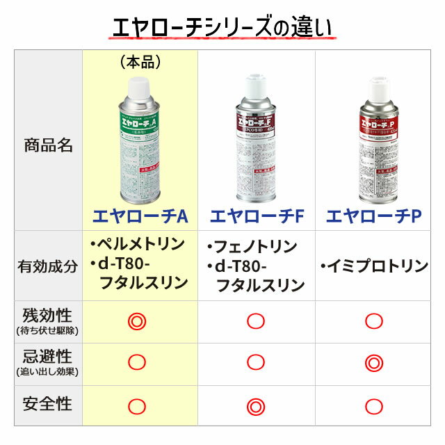 ・追い出し効果(フラッシング)・ノックダウン効果で選ぶなら エアローチP ・成分の高い安全性と速効性で選ぶなら エアローチF ・速効性と残効性で選ぶなら エアローチA エヤローチAとは? ゴキブリ・ノミ・トコジラミ・イエダニ駆除用の殺虫スプレー(業務用)です。 エヤローチAは「殺虫駆除」・「残効性」・「隙間のゴキブリ追い出し」の3つの特徴がある殺虫エアゾールです。安全性は高くなっています。 エヤローチAには、ゴキブリを瞬間にノックダウンさせる成分(フタルスリン)と、高い駆除効果・残効性をもつ成分(エクスミン)が配合されています。 そのため、ゴキブリの即効的な駆除と残効性を重視するならエヤローチAです。 ★(1本でのお求めは)エヤローチA 1(420ml)はこちら 殺虫駆除する 目の前に現れたゴキブリを駆除する場合、ゴキブリに噴射して駆除して下さい。 隙間のゴキブリ退治・ゴキブリの追い出し 隙間に噴射すれば、中に潜むゴキブリを退治または追い出す効果があります。 隙間から追い出され飛び出てきたゴキブリは、再度、噴射して直接退治してください。 忌避させて予防 エヤローチAの成分はゴキブリを駆除するための成分ですが、ゴキブリの嫌がる成分でもあります。そのため、あらかじめ戸棚の隙間や、コンロの下、客席の周辺などに噴霧しておけば、ゴキブリの生息の予防にもなります。 【直接噴霧】 上部にある押ボタンを押してゴキブリなどの害虫に直接噴霧する。 【残留噴霧】 ゴキブリの潜伏場所や出現頻度の高いと思われる場所に 約20cmの距離から 帯状に 十分濡れる程度(1m2当り20〜40秒程度、15〜20ml 程度)に噴射塗布して下さい。  (噴霧場所例 : 流し、コンロ台、戸棚の引出し、床、壁など) ※噴射しにくい狭い場所には、付属のノズルを噴射口に挿入して使用してください。 ページTOPへ