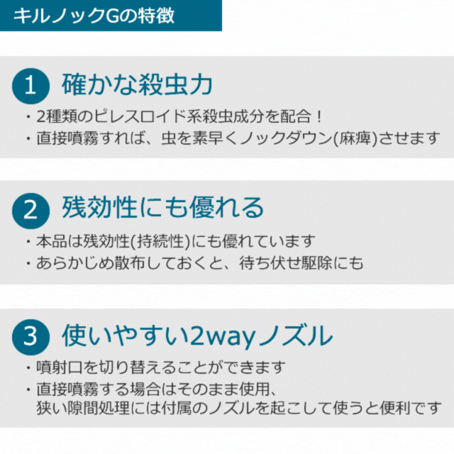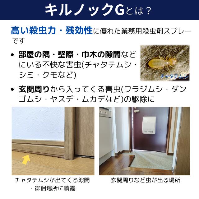 キルノックGとは? キルノックGは業務用の不快害虫用殺虫スプレーです。 チャタテムシやシミ、クモ、屋外から侵入するムカデ・ヤスデ対策などに使えます。 ■ノズルを切り替えることができ、狭い隙間にもご利用いただけます。 ■1本420ml入りです。 ★(お得用)キルノックG 1箱(480ml×30本)はこちら ★(部屋用速乾タイプの殺虫剤)キッチン虫スプレー (420ml)はこちら 抜群の殺虫効果 2種類のピレスロイド系殺虫成分を配合しており、殺虫力に優れています。直接噴霧すれば、虫を素早くノックダウン(麻痺)させることができます。 残効性にも優れる 本品は残効性(持続性)にも優れています。そのため、虫がよく通るところにあらかじめ散布しておくと、待ち伏せ駆除にも使用できます。 使いやすい2wayノズル 噴射口を切り替えることができます。 直接噴霧する場合はそのまま、巾木などの狭い隙間処理には付属のノズルを起こして使うと便利です。   こんな害虫駆除におすすめ ・壁と床や壁と巾木のすき間から出てくるチャタテムシ駆除に ・本棚や放置した段ボールから発生したシミの駆除に ・玄関まわりにいるアリやムカデ、ヤスデ、ダンゴムシ、ワラジムシ、クモの駆除などに ■散布方法 (1)通常噴射 : ノズルは垂直に下ろして噴射してください。 (2)ノズル噴射 : ノズルを90度に上げてから噴射してください。 ※逆さまにして使用しないでください。 ※90秒以上連続噴射しないでください。 ※噴霧後は換気してください。 ■使用方法 ボタン後部のロックピンを引き抜き、上部にある押しボタンを押して噴霧してください。 (1)直接噴霧 害虫に直接1〜2秒噴霧する。 (2)残留処理(待ち伏せ駆除) 害虫の通り道に1m²当たり約20秒程度(20〜30ml)を噴霧塗布する。 ※散布量が多いとべたつく場合があります。 べたつきが気になる場合は拭きとってください。 (3)フラッシング(追い出し) 害虫の生息する隙間に1〜2秒噴霧する。 ■ガス抜き機構 (1)中身を使い切った後ボタンを押しながらボタン後部の隙間にロックピンもしくは10円玉硬貨を差し込んでボタンをロックする。 (2)噴射音が完全に消えてから数分間放置した後、適切に廃棄する。 ページTOPへ
