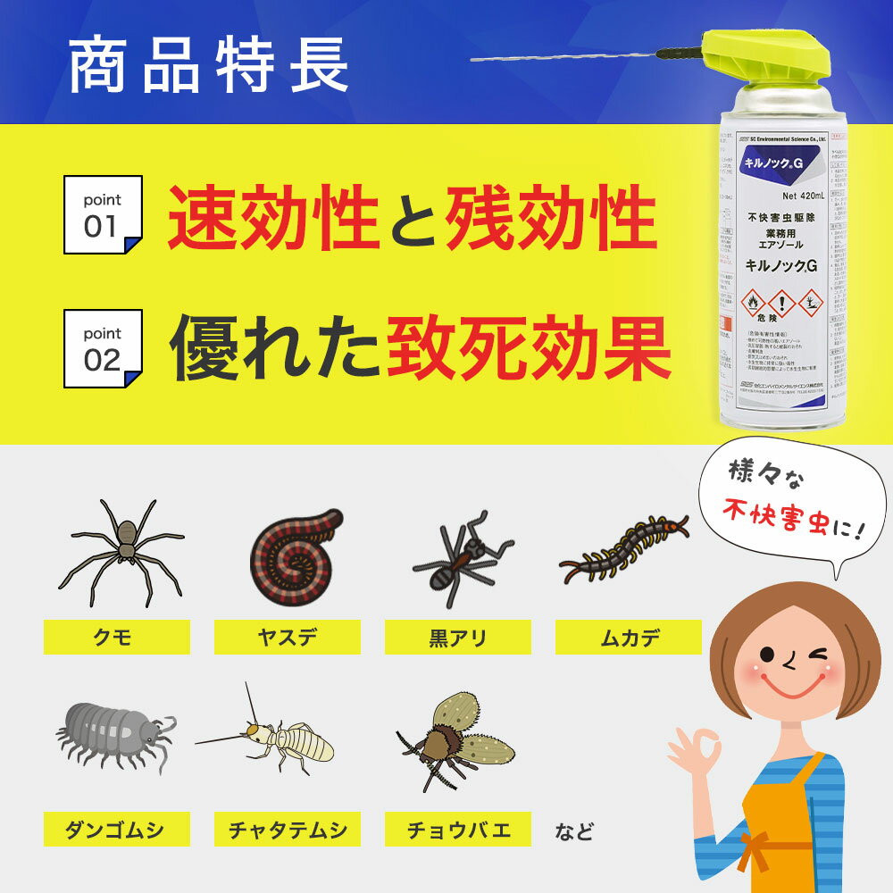 商品名 キルノックG 内容量 420ml 主成分 シフェノトリン、イミプロトリン 剤 形 エアゾール 使用用途 ワラジムシ チャタテムシ ダンゴムシ ヤスデ ムカデ クロアリ クモ 不快害虫用 販売元 住化エンバイロメンタルサイエンス株式会社 ●商品特長 ◆速効性と残効性を併せ持つ業務用エアゾール! ◆速効性と優れた致死効果を発揮します。 ◆隙間への噴射に便利な専用ノズル付き。 ●使用方法 ●フラッシング:害虫の生息する隙間に1~2秒噴霧する。 ●直接噴霧:害虫に直接1~2秒噴霧する。 ●残留処理:害虫の通り道に1㎡当たり約20秒程度(20~30ml)を噴霧塗布する。 ●使用上の注意 ◆定められた使用方法を厳守すること。 ◆使用用途以外には使わないで下さい。 ◆直射日光のあたる場所、高温になる場所での保管は避けて下さい。 ◆子供の手の届かないところに保管して下さい。 ◆その他、使用上の注意をよく読んでから使用すること。 ※パッケージは予告なく変更されることがあります。