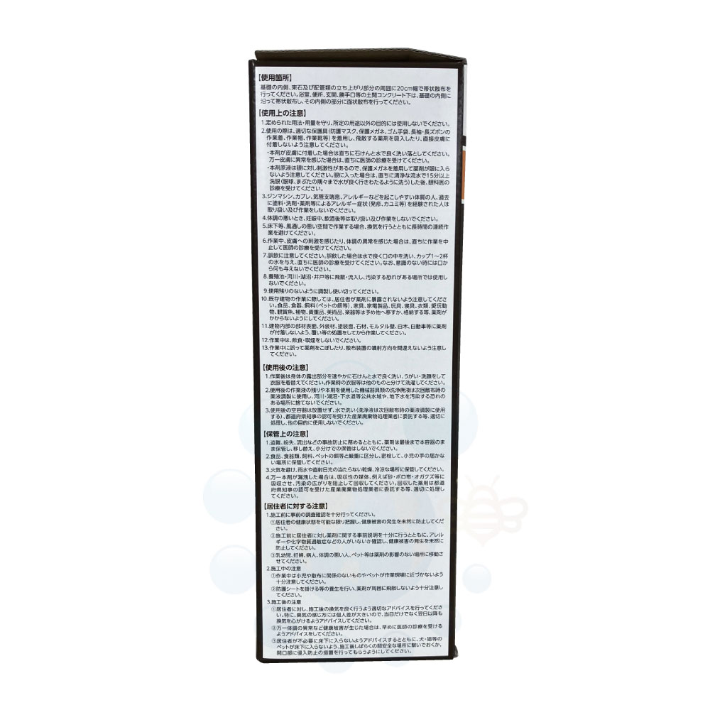 商品名 白アリスーパーPRO・50 内容量 1L 有効成分 ピリプロール (防虫剤) 2.5% 性 状 水性(50倍希釈) 色 淡褐色 臭 気 低臭 効 能 シロアリ予防・駆除 標準使用量 50倍希釈液3~5L/m² (原液60~100mL/m²) 毒劇物 対象外 消防法 危険物に該当しません。 認 定 (公社)日本しろあり対策協会 (公社)日本木材保存協会 販売元 株式会社吉田製油所 ●商品特長 ◆優れた性能と安全性が証明された認定薬剤です。 ◆低臭性でリフォームや既築住宅でも安心してお使いいただけます。 ◆対アルカリ性が強く、コンクリートのアルカリで分解されません。 ◆遅効性で広範囲に長期的効果。 ◆水で希釈して使用するので環境に優しい水性製品です。 「持続性」 ピリプロール (遅刻伝播性) 「低臭性」 「吸着性」 長期に渡りバリア層を形成 「耐アルカリ性」 ベタ基礎でも安心 ●使用方法 ◆水で50倍に希釈して建築物の床下基礎内側、束石、配管立 ち上がりの周囲20cmに散布して下さい。 (詳しくは日本しろあり対策協会のホームページ参照) ※パッケージは予告なく変更されることがあります。