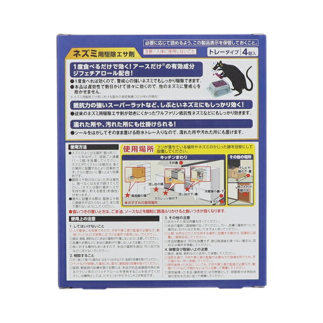アース製薬株式会社 デスモアプロ トレータイプ 15g×4トレー薬剤に抵抗性のあるスーパーラットにも効く!!カツオ・サツマイモ・ピーナッツ配合でよく食いつく!!◆特長● 有効成分ジフェチアロールを配合! 1度食べれば効くので、警戒心の強いネズミでもしっかり駆除! ワルファリン等は、3〜5日連続して食べることが必要ですが、 ジフェチアロールは、ひとくち(一度)食べれば、優れた効果を発揮します。 これを食べたネズミは内出血をおこし、数日かけて徐々に死に至りますので、 他のネズミに警戒心を抱かせません。● トレータイプ シールをはがしてそのまま置ける防水トレー入りなので、濡れたところや汚れた ところにも置けます。● 抵抗性の強いスーパーラットにもよく効く!! クマネズミ、ドブネズミ等の大型ネズミはもちろん、これまでに効きにくかった スーパーラット(ワルファリン抵抗ネズミ)など、どんなネズミにもしっかり 効きます。◆ 使用方法● ネズミのよく出る場所数箇所に、シールをはがして、容器ごと適量 (約10g〜30g)を配置してください。容器には15g入っています。 ネズミのたくさんいる場合は、多くの場所に設置するとより効果的です。 さらに壁沿いに置くと効果的です。● 薬剤のなくなったところは補充し、食べなくなるまで続けてください。● ネズミは隠れ場所へエサを持ち帰り、貯える習性(貯食性)があります。● 屋外に配置する際は、薬剤に直接光が当たらないよう、また雨に濡れない ようにしてください。● 食いつきの悪いときはコーン油、ソースなど顆粒に数滴ふりかけると食いつき がよくなります。 ※デスモアプロ トレータイプ1個【送料別】でのお求めはこちらから ※デスモアプロ トレータイプ20個【送料無料】でのお求めはこちらから ジフェチアロール(第二世代世代抗凝血性殺鼠剤) 配合の殺鼠剤はこちら! ねずみ対策・駆除に!殺鼠剤・毒エサ いろいろご用意しました デスモア プロ投げ込みタイプ デスモア プロトレータイプ 最後の晩餐トレータイプ 業務用チューモアブロック まとめ買いやその他の殺鼠剤・毒エサはコチラ LINE公式アカウントはじめました 友だち追加特典300円OFFクーポン