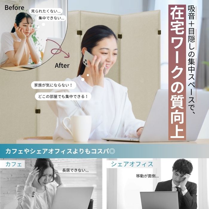 吸音×目隠しで、自宅が“集中ブース”に 在宅ワーク中、家族の声が気になって集中できない。 逆に「声がうるさい」と注意されてしまうことも…。 そんな悩み、ありませんか? カフェやシェアオフィスを利用する手もありますが、 費用もかかり、毎回の移動も意外と面倒です。 吸音パーテーションなら、 視線を遮る“目隠し”+“吸音”のW機能で、 自宅の一角が、あっという間に集中ワークスペースに変わります。 さらに、メモを貼れる表面や、配線を通せる隙間設計など 「仕事がしやすい」工夫も満載。 置くだけで、在宅ワークの質がぐっと高まります。 体感“半分”の吸音効果 吸音効果は最大10dB(※4000Hz時)。 体感で“音が半分程度に減る”と言われるレベルです。 高密度ポリエステル+フェルトの3層構造、そして3cmの厚み。 この設計が、反響音やノイズを抑えてくれます。 だから、リモート会議や電話はもちろん、 録音や動画撮影にも最適。 音を気にせず、自分のペースで作業に集中できます。 女性ひとりでも運べる軽さ 1枚わずか2.6kg。女性ひとりでも、片手でラクに運べる軽さです。 これは、一般的なオフィスパーテーションの約1/4の重さ。驚くほど軽量です。 分割できる設計だから、持ち運びも収納もスムーズ。 片腕に収まるサイズ感で、部屋の移動もストレスなし。 しかも、ジョイント部分は工具不要のマジックテープ式。 しっかり固定できて、外れにくいのに、片手で着脱可能。 部品がないので、小さなお子様やペットのいるご家庭でも安心です。 好きなカタチに、自由にレイアウト 90cm幅のワークデスクにもぴったりフィット。 「コ」「十」「V」「一」など、空間や用途にあわせて自在に配置できます。 間仕切りとして使ったり、視線を遮る壁にしたり。 “ちょうどいい場所に、ちょうどいいカタチ”が叶います。 さらに、セットを組み合わせれば拡張も可能。 6連、8連、10連…と、必要な長さに合わせて増やすことができます。 使いたい場所に合わせて、柔軟にレイアウトが広がります。 壁に立てかけるだけで、防音対策に 使い方は、間仕切りだけではありません。 壁に立てかけるだけで、簡易的な防音壁としても活躍します。 たとえば、話し声・ピアノ・ペットの鳴き声・ゲーム音・テレビ音。 ご家庭で気になる音を軽減し、隣室への騒音トラブルを防ぎます。 貼り付け不要だから、賃貸でもOK。 壁に穴を開けることなく、気になる場所にすぐ設置できます。 (※立てかけ時は転倒防止のため、安全に配慮してご使用ください。) 使わないときも、無駄にならない 「収納が面倒…」というパーテーションの弱点も、この商品なら解決。 実は、開いた状態のまま“隠す収納壁”として使えるんです。 生活感のあるものをさっと隠して、部屋の印象もすっきり。 もちろん、使わないときは折りたたんでコンパクトに。 アコーディオンのようにサッとまとめて、壁際にすっきり収納できます。 畳んでも、広げても、無駄がない。 暮らしに自然と溶け込む設計で、使い方はあなた次第です。 ■注意事項/その他 ・Web画面上の色や柄と、実際の製品の見え方は光の加減などにより異なる場合がございます。 ※画像はイメージです。 【北海道・沖縄・その他離島のお客様へのご案内】 誠に恐れ入りますが、本商品は 北海道・沖縄・その他離島への配送を承ることができません。 近年の配送料金の高騰により、ご対応が難しくなっております。 また、販売チャネルによって対応状況が異なるため、何卒ご理解賜りますようお願い申し上げます。 万が一、該当エリアからのご注文をいただいた場合は、誠に申し訳ございませんがキャンセル対応とさせていただきます。 なお、該当エリア以外のお客様につきましては、通常どおりご注文いただけます。
