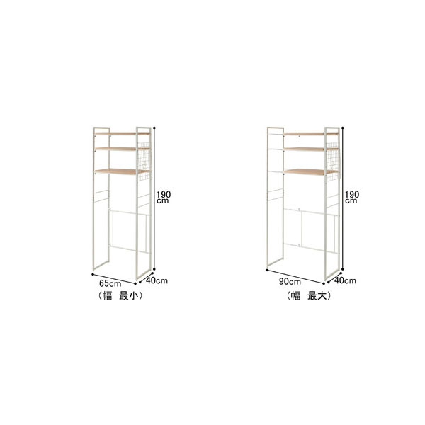 北欧テイストの洗濯機置き台。3枚の棚をお好きな位置に調整する事が出来、サイドネットも左右どちらにもかけられることが出来ます。また天板はPVCですので水に強い仕様になっています。【北欧インテリア家具・雑貨のhocola】(検索用)02z525〔外寸〕幅65~90・奥行40・高さ190cm〔可動棚〕3枚・10cmピッチ〔耐荷重〕約5kgスチール(粉体塗装) MDF(PVC真空成型貼)※フック2個付※アジャスター付●台湾製※組立式