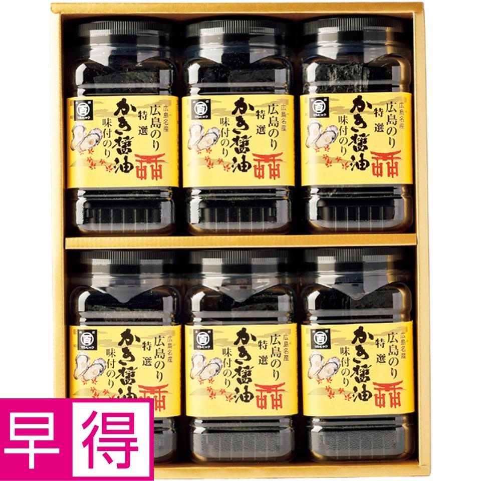 【冬の贈りもの早得】広島海苔特選かき醤油味付のり6本入[大切な人に贈る、ほっとくつろぐ、とくべつな時間]【早得予約は12/10(水) 15時まで】※早得期間終了後は、本体価格3,000円(税込3,240円)となります。※配送料は、早得割引対象外です。広島特産、かきの旨み豊かなエキスを使用した調味液で味付けしました。口どけの良さが人気です。●商品詳細:特選かき醤油味付のり8切32枚×6●原料原産地:乾のり(日本)、みりん(日本)、唐辛子(韓国産)、かきエキス(広島県産)●賞味期限:常温にて365日間●特定原材料:小麦・えび・大豆●配送温度:常温※商品のご注文・お届け・キャンセルについて 複数個口のご注文も個別に配送します こちらの商品は包装形態を選択できます ギフト商品は、発送手配開始後のキャンセルは原則お受けできません。 こちらの商品には、配送料350円(税込385円)が含まれております。予めご了承ください。※画像はイメージです。2
