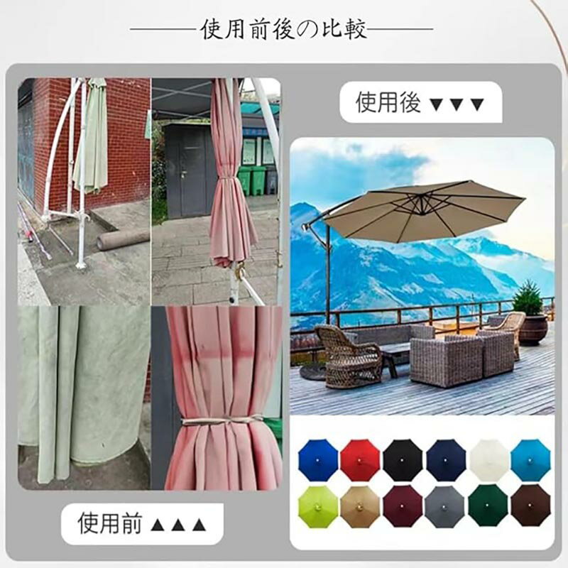 【日除け効果】ガーデンパラソルの交換用キャノピーは、有害な直射日光からお庭を効果的に保護し、日除け効果も抜群です。 【高品質の材料】私たちの傘布は良質なポリエステル生地を採用し、紫外線処理と防水処理を経て、丈夫で丈夫でしわに強く、しかもカビや虫食いを恐れない。 [商品サイズ]日除け替え布の直径は2m、2.3m、2.5m、2.7m、3m、3.5m、傘骨は6本と8本があり、サイズも色も豊富で、実際のニーズに応じて適切な商品を選ぶことができます。 【 使いやすい】組み立て簡単、工具不要。木製、スチール製、アルミ製のパラソル フレームに適しています。 雨上がりでもすぐに乾きます。 取り外して洗えるので、使用後のお手入れも簡単。 【幅広い用途】交換用パラソルは、家や庭の周りで、個人的な日よけシェルターとして使用するのに適しています。キャンプ場、ビーチ、遊び場、パーゴラ、温室などにも簡単に設置できます。 ※注意事項 サイズ・重量は、多少の誤差が生じる場合がございます。 お使いのブラウザや設定により、画像と実際の商品との若干の色の違いが生じる場合がございます。予めご了承いただけますようお願いいたします。 ※簡易包装となりますのでご理解の程よろしくお願いします。 ※仕様・デザインは改良のため予告なく変更することがあります。 ご注意いただけましたら幸いです。