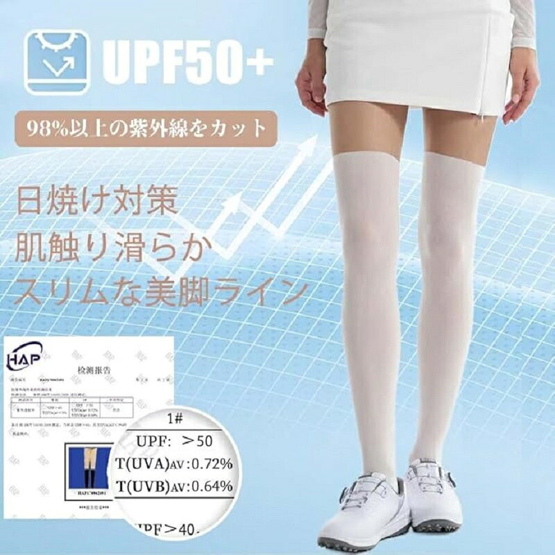 【3in1オールインワン設計】ストッキング+ニーソックス+ペチパンツの機能を1枚に集約。シームレスで段差がなく、スリムな美脚ラインを実現。ショートパンツ着用時でも安心のヒダ見えガード付き。 【UVカット日焼け止め】紫外線カット、夏場の日焼け対策に最適。薄手ながら透けにくく通気性に優れ、長時間のゴルフやアウトドアでもムレにくく快適な履き心地を提供します。 【伸縮性 フィット感抜群】ナイロン90%・ポリウレタン10%の高伸縮素材を使用し、動きやすいです、スポーツにも対応し、太ももの跡が残らずソフトなウエストバンドで自然なシルエットをキープします。サイズはフリー、体重45-70kg対応できます。 【接触冷感 吸汗速乾】涼しさを感じる冷感素材で、暑い季節でもひんやり快適。汗を素早く吸収・発散するので不快なべたつきを軽減し、一日中サラッと快適に過ごせます。ガーリーからカジュアルまで幅広くコーディネート可能。ゴルフはもちろん、テニス、ヨガ、ランニングなどさまざまなスポーツや普段着としても活躍する万能レギンスです。 暑い夏に快適性を保つため、生地には滑らかな冷感素材を使用しています。普段ストッキングとしては大丈夫ですが、激しい運動をする場合は、足裏部分にもう一枚スポーツソックスを重ね履きした方がより安心です。