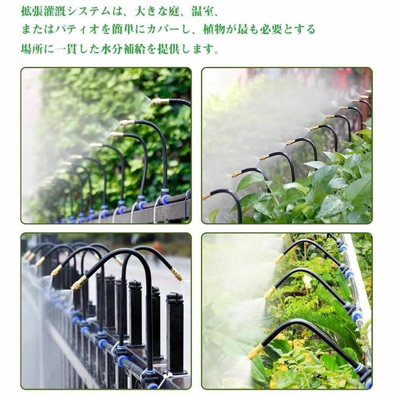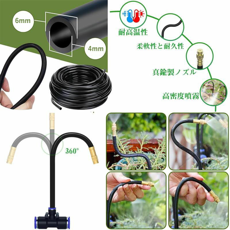 【装着簡単・DIYデザイン】この灌水システムは、360度調整可能な最新ノズルとサポートロッドを採用しています。複数の分岐パイプを使って方向を調整する代わりに、すべてのスプリンクラーヘッドが1本のパイプに固定されているため、設置が簡単です。花壇に巻き付けたり、プランターに巻き付けたり、芝生に蛇行させたりと、このシステムはあなたのレイアウトに合わせて調整できます。 【高品質・強い耐久性】高品質の素材、耐高温性、真鍮製ノズル、耐久性、防爆性、防錆性、そして高密度噴霧。水量が多いほど効果は高まります。この軟水管の内径は6mm、外径は8mmです。 【調整可能 】調整可能なノズルで流量とミストの強度を制御できるため、節水しながら植物に適切な水分を自動で供給できます。 【ミスト灌水&自動散水】花、野菜、どんな植物でもミスト灌水システムはあらゆる環境に正確な水分補給を提供します。 DIY愛好家、植物の栽培者、そして環境に配慮した栽培者に最適です。 【屋外冷却】電源は必要なく、電気代不要で経済的です。シャワーから出てくる細かい水の粒子が、気化熱を利用して気温を下げるので、夏の熱中症対策にもピッタリ!屋外用ミストスプレーがあれば、ご家族、ペット(犬、猫、鶏)、家畜、そして植物も、暑い日でも快適に過ごせます。
