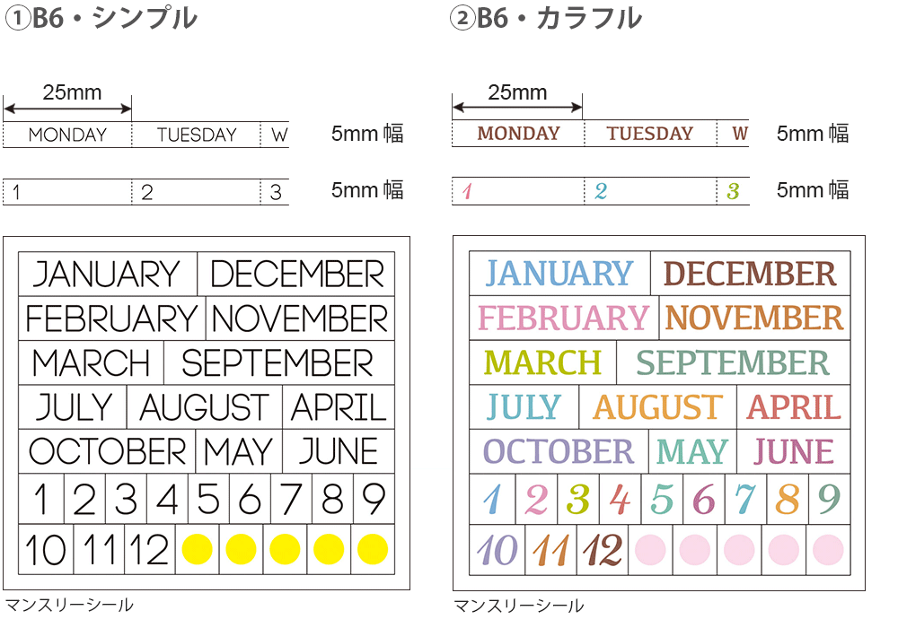 日付と曜日の組み合わせで、手帳が作れるマスキングテープセットです。 マスキングテープにミシン目が入っているので、綺麗にカットできます。 約一年分の手帳が作れる分量です。 内容:日付マスキングテープ1個 曜日マスキングテープ1個 マンスリーシール1シート 本体サイズ B6・シンプル(TM01095)、B6・カラフル(TM01096) 曜日テープ/5mm幅× 約4.2m巻 日付テープ/5mm幅× 約9.3m巻 縦A5・ベーシック(TM00877)、縦A5・カラー(TM00878) 曜日テープ/6mm幅×約4.5m巻 日付テープ/6mm幅×約9m巻 B6・カラー(TM00871) 曜日テープ/5mm幅×約4.5m巻 日付テープ/5mm幅×約9m巻 日本製 TM01095 TM01096 TM00877 TM00878 TM00871 (メーカー希望小売価格はメーカー商品タグに基づいて掲載しています)