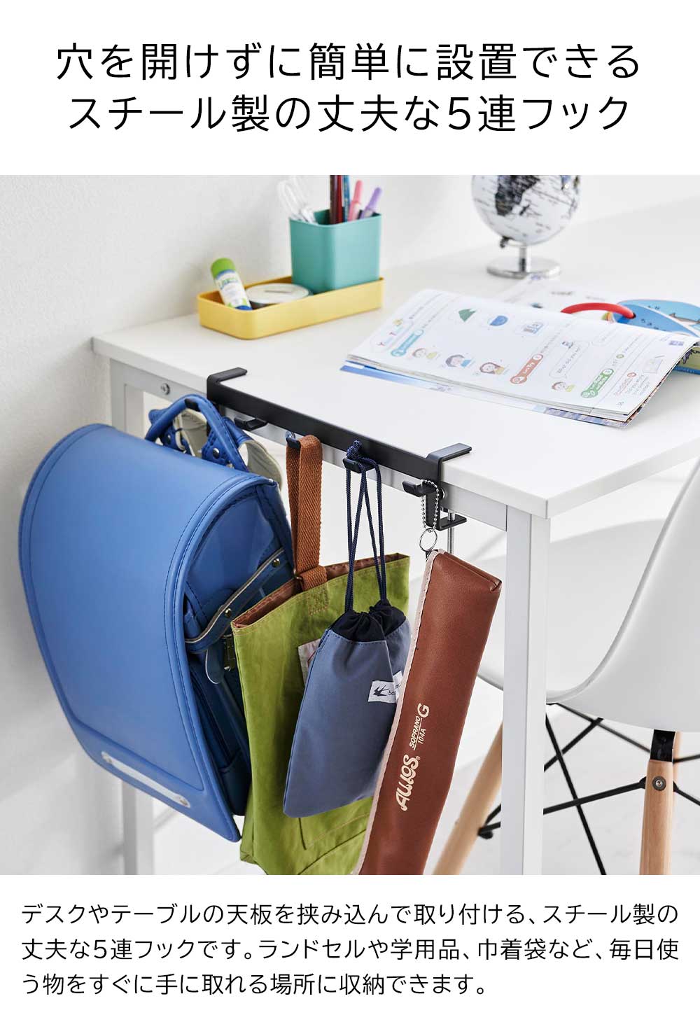 商品名称 テーブル横フック タワー 商品スペック 商品サイズ W30.5×D7×H7〜11cm(調節ネジ含む) 内寸サイズ フック:W1.5×D2×H0.8cm(1つあたり) フック同士の間隔:W5.5cm 対応サイズ 天板の厚さが1.2〜5cm(幕板やパイプなど含む)、幅30.5cm以上(脚含まず)、奥行き4cm以上のデスク・テーブル・キッチンカウンターなど ※設置する部分の構造によっては取り付けできない場合があります。 重量 310g 耐荷重 7.5kg(フック1つあたり1.5kg) 品質表示 本体:スチール(粉体塗装) 付属品 六角レンチ 原産国 中国テーブル横フック タワー 調節ネジで簡単取り付け テーブルやデスクの横が 引っ掛け収納スペースに! リュックやランドセル、レッスンバッグや巾着袋など、すぐに手に取れる場所に引っ掛けておきたいアイテムは意外と多いもの。 それらをテーブルやデスクの横にまとめて収納できる、5連の丈夫なスチール製フックです。 テーブルを挟み込んで調節ネジで固定するだけの簡単設置なので、大切な家具に穴を開けることなく、お手軽に引っ掛け収納スペースを増やせます。 ヘッドフォンやヘッドセットなど、デスク周りにあると嬉しい小物を掛ける場所にするのも便利です。