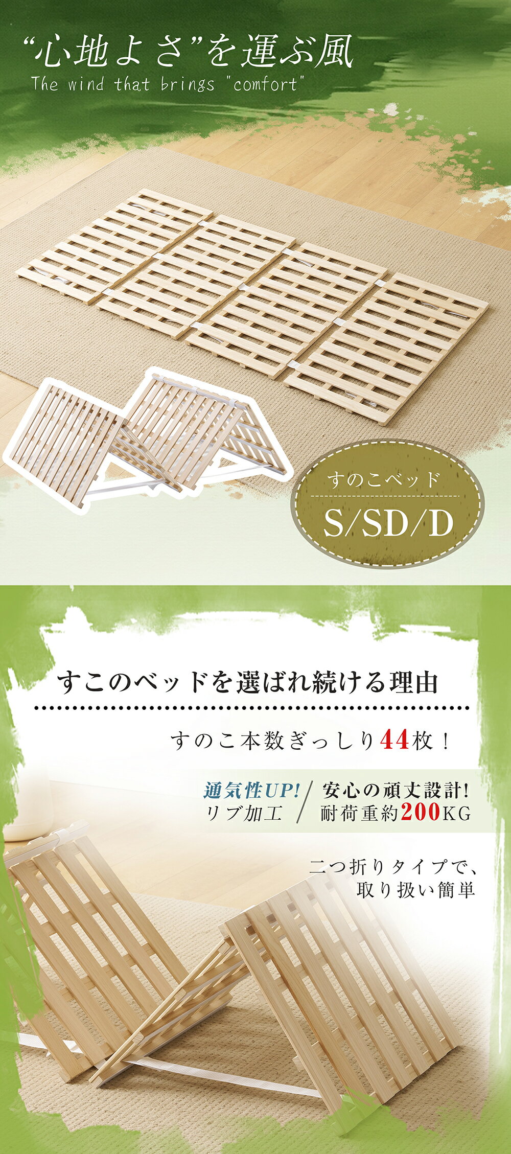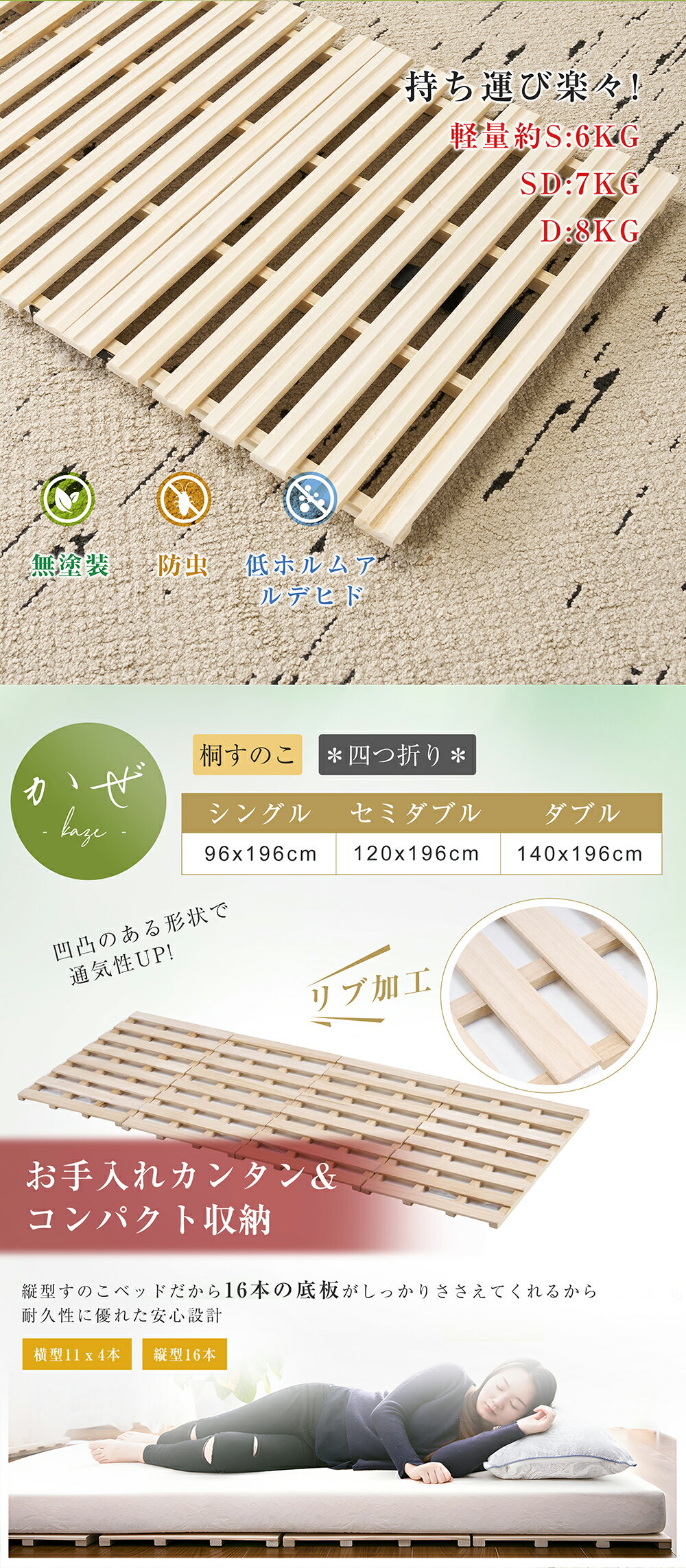 --> 商品仕様 材質 本体:天然桐材(無塗装)滑り止め:EVA 商品サイズ 使用時:(約)幅97×奥行196cmx厚み2.5cm収納時:(約)幅100×奥行46×厚み11cm 商品説明 ★優れた湿気対策、防カビ、防虫桐天然材を利用★すのこ板60枚に改善されたことで、ごつごつ感軽減!寝心地アップ!★使わない時は折り畳んでコンパクトに★床に触れる面には全て滑り止めのクッション材★角は面取りをして丸み加工★すのこ板に凹凸のあるリブ加工+通気口!2重効果で通気性実現! 重量 約7.1kg 耐荷重 約200kg カラー ナチェラル 商品番号 pp004034 出荷形態 お客様組立品 備考 ※サイズ表記に1~2cm程誤差が生じる場合がございます。あらかじめご了承ください。※商品の色は、画面の設定により若干の違いがある場合がございます。 運輸 【モデル商品】※予約販売商品以外明日楽対応 ※送料無料(沖縄県/離島/北海道は別途)※沖縄県/離島/北海道の場合はお問い合わせください。 ※本商品は同梱不可となります。他の商品と一緒にご購入する場合は別途送料が発生します。 ※運送途中に損害をもたらす可能性があり、ご心配なく気軽に弊社へとご連絡ください。 ※良品について一切返品することはできませんのでご遠慮くださいませ。