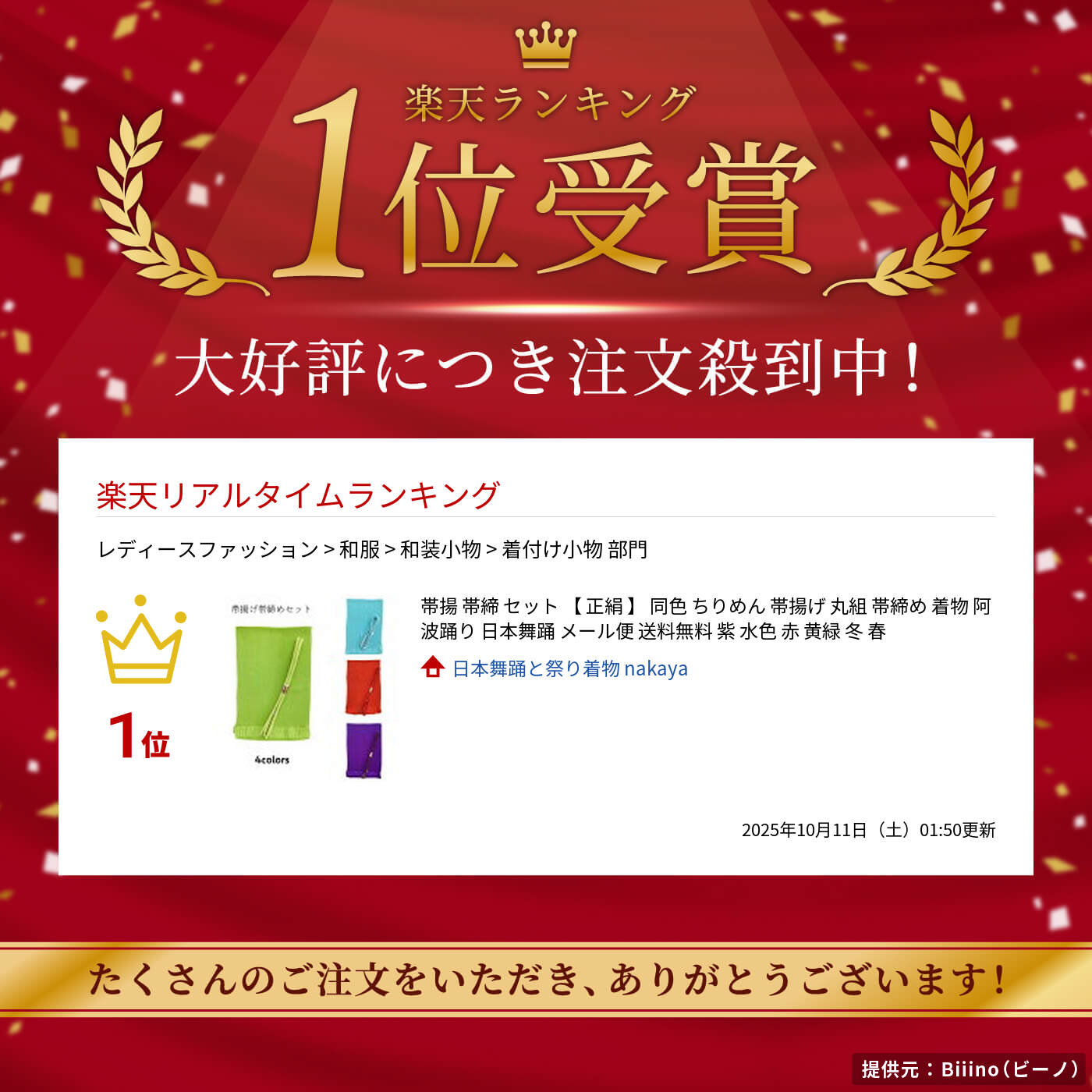 商品情報 素材 帯揚げ:絹100%帯締め:レーヨン/絹(今後在庫のなくなった色から順次ポリエステル製に変更いたします)ご確認ください ・汗や摩擦により色落ち・色移りの可能性があります。・ご自宅での水洗いはできません。ご使用後は影干ししてご利用ください。・商品写真はなるべく実物に近い色を載せておりますが、モニターにより実際の商品と多少のズレが生じる場合がございます。・実店舗との在庫共有の為、ご注文のタイミングにより在庫切が生じる可能性がございます。 【日本のモノと踊りnakaya】について 東京・高円寺にて 和装 品 を中心に 日本舞踊 新舞踊 民踊舞踊の 踊り衣装 ( 着物 帯 半幅帯 着付け小物 二部式襦袢 半襦袢 東スカート女踊り 男踊り用 草履 雪駄 半衿 袴 足袋 腰ひも 伊達締め 帯揚げ 帯締め ステテコ 裾引き お引き 髪飾り かんざし )や 舞踊小道具 ( 扇子 笠 傘 刀 鈴 )を取り扱っています。 舞踊に携わる皆様の生活( 洗える着物 ポリエステル着物 附下 訪問着 紬 小紋 和装バッグ )を支えるお役に立ちたいと考えています。 また日本の素晴らしい文化を少しでも伝えることができればと、季節の 贈り物 ギフト や お配りもの お礼の品 や ご挨拶 の品 等の提案もしております。 お宮参り 百日祝い お正月 入学式 卒業式 七五三 入園式 卒園式 成人式 結婚式 結納 などのお祝いの礼装や お葬式 法事 等の弔事の礼服としてもご活用いただけるよう商品を取り揃えております。 -- 着物 -- 小紋 紬 浴衣 などの カジュアル 普段着 着物 を始め、 訪問着 や 付下げ も 洗える ポリエステル製を中心にご提案しています。 ご家庭でお洗濯ができお手入れが簡単になることで、気軽に着物生活を楽しんでいただきたいと考えています。 すぐに着用できる お仕立て上がり を始め、 反物 や オリジナル寸法でのお仕立ても承っています。 日本舞踊の お稽古着 や 舞台衣装 お茶のお稽古やお茶会、華道 巫女衣装 仲居 さん や 料亭 など和のお稽古やお仕事用としても便利です。 大量注文 や お揃い でのご注文はお時間をいただく場合もございますが可能な限り迅速丁寧にご対応いたしますので是非ご相談ください。 -- 帯 -- 日本舞踊でよく使用される 半幅帯 四寸帯 後見帯 博多献上 金蘭 昼夜帯 朱子帯 を始め 礼装用 の 袋帯 、 普段着用 の 名古屋帯 京袋帯 へこ帯 角帯 などをご用意しています。 -- 襦袢 裾除け 肌着 -- 日本製 の 高品質なものを中心に使いやすく長持ちするものをセレクトしています。 二部式 襦袢 を中心に 半襦袢 ファスナー式 半襟 すそよけ 東スカート 長襦袢 筒袖半襦袢 きものスリップ 浴衣スリップ 肌襦袢 踊り用 --季節について-- 春 3月 4月 袷 の季節。 明るい 色や 花 の模様を取り入れて春の 軽やかな雰囲気を楽しみたいです。 羽織 をさらりと羽織るのも コーディネート の楽しみの1つ。 卒業式 卒園式 入学式 など行事の時には訪問着や付下げ、色無地などが◎ 初夏 梅雨 5月 6月 袷 単衣 の季節。気温の高い日も増えてくるので 暑さ対策 を。6月は 単衣 + 夏用半衿がおすすめ。 夏 盛夏 7月 8月 夏物 絽 紗 羅 麻 などの夏生地が基本。 肌着 や 襦袢 も 暑さ 汗 対策ができるものを選ぶと◎ 秋 9月 10月 11月 袷 の季節。深い 濃い 色合いを楽しめる秋。過ごしやすい日も増えるので 羽織 や 道中着 道行 を楽しめる季節。 冬 12月 1月 2月 袷の季節。 寒い日が増えるので コート 和装ストッキング 足袋インナー などで 寒さ対策 を。 土地柄 阿波踊り との関わりも強く、衣装制作 や 小物の製作 販売もしております。 舞踊用品や阿波踊り 祭り用品で商品掲載のリクエストがございましたらお問い合わせよりご連絡くださいませ。帯揚・帯締セット【正絹】 同色の帯揚げ・帯締めセット 同色のちりめん帯揚・丸組帯締のセットです。帯揚は正絹、帯締は絹・レーヨン製です。 新舞踊や民踊舞踊、阿波踊りにもご使用いただけます。汗・摩擦により色落ちの可能性があります。 ご自宅での洗濯はできません。使用後は影干ししてください。帯揚げ:絹100%帯締め:レーヨン/絹(今後在庫のなくなった色から順次ポリエステル製に変更いたします) 5