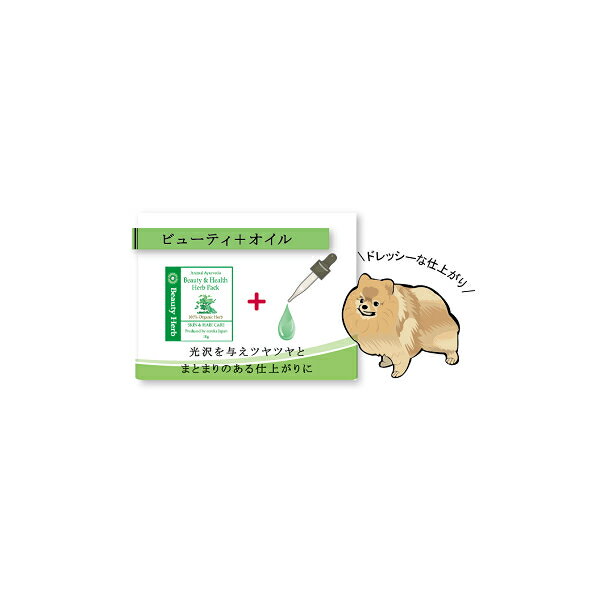商品説明 ビタミンE豊富なセサミオイルにハーブエキスを配合。ハーブパックに混ぜて、皮膚に潤い、被毛に輝きを与え、フケ・毛玉防止に。 【小型犬20〜30回分】◆ビューティオイル、スキンバターの保存について◆開封後はなるべく半年以内で使い切るようにしてください。特に容器の口部分に付着したオイルやバターはティッシュなどで綺麗にふき取って、口をしっかり閉めてから保管してください。光が当たると劣化が早くなるので、冷暗所で保管してください。ビューティオイル ? フケを抑えドレッシーな仕上がりにハーブパックに混ぜて、皮膚に潤い、被毛に輝きを与え、フケ・毛玉防止に。潤いアップ・美しさ長持ちチワワやダックスのロング、ポメラニアンやパピヨンなど、毛の広がりを抑えまとまった仕上がりにしたい時におすすめ。ハーブペーストに混ぜるだけ小型犬なら小さじ一杯をハーブペーストに混ぜるだけ。保湿力を高めるので毛玉防止作用、静電気防止作用がさらにアップ。パックとオイルの組み合わせ・ビューティ&ヘルスハーブパック+オイルチワワやダックスのロング、パピヨン、ポメラニアンなど、ボリュームを抑えてまとまった仕上がりにしたい時におすすめ。プードルやビションも少量のオイルを加えると毛玉防止効果がアップ。・ドクターズヘルスハーブパック+オイルオイリースキン向けのドクターズパックとビューティーオイルの組み合わせはレアケース。混合肌の場合は、べたつく部分にオイル無しペーストを塗布し、乾燥部分にはオイル入りのペーストを。・モイスチャーヘルスハーブパック+オイルドライスキンにおすすめの組み合わせ。乾燥によるフケや痒みを鎮めたい時にアロエベラとオイルでダブル保湿。静電気で汚れが目立つ白毛の子やゴワゴワ被毛を柔らかくしたい時にもおすすめ。