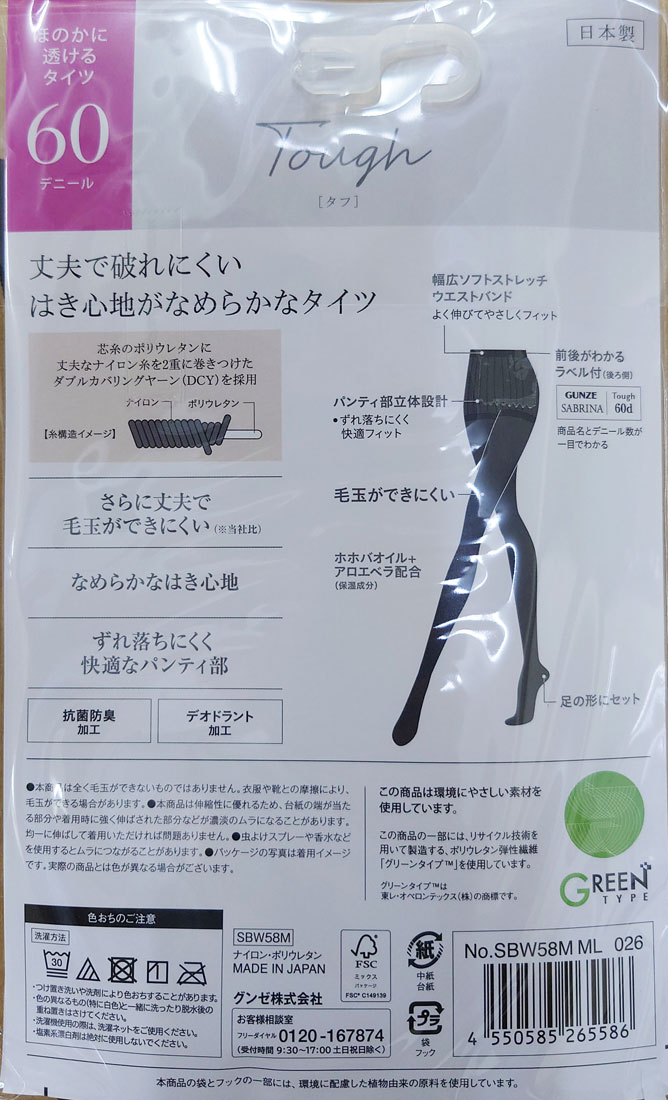 :.☆*.:*: ★ :.☆*.:*: :.☆*.:*: :.☆*.:*: ★ :.☆*.:*: :.☆*.:*: :.☆*.:*:★ :.☆*.:*: ※こちらはメール便送料無料の2足セットです。メール便以外の配送方法はお選びいただけません。 SABRINA Tough 60デニール 毛玉ができにくい 丈夫なナイロン糸を二重に巻き付けたDCY糸を使用。 ★ 商品仕様 ★ 素材: ナイロン・ポリウレタン サイズ: M-L ヒップ: 85-98cm 身長: 150-165cm L-LL ヒップ: 90-103cm 身長: 155-170cm カラー: ブラック 黒・ダークチャコール 特徴: ・幅広ソフトストレッチウエストバンド ・前後がわかるラベル付き ・パンティ部立体設計 ・毛玉ができにくい ・足型セット ・ホホバオイル+アロエベラ保湿成分配合 ・抗菌防臭加工 ・デオドラント加工 生産: 日本(商品登録時点) メーカー: グンゼ :.☆*.:*: ★ :.☆*.:*: :.☆*.:*: :.☆*.:*: ★ :.☆*.:*: :.☆*.:*: :.☆*.:*:★ :.☆*.:*: ※画面上と実物では、多少色具合が異なって見える場合がございます。 ご了承ください。
